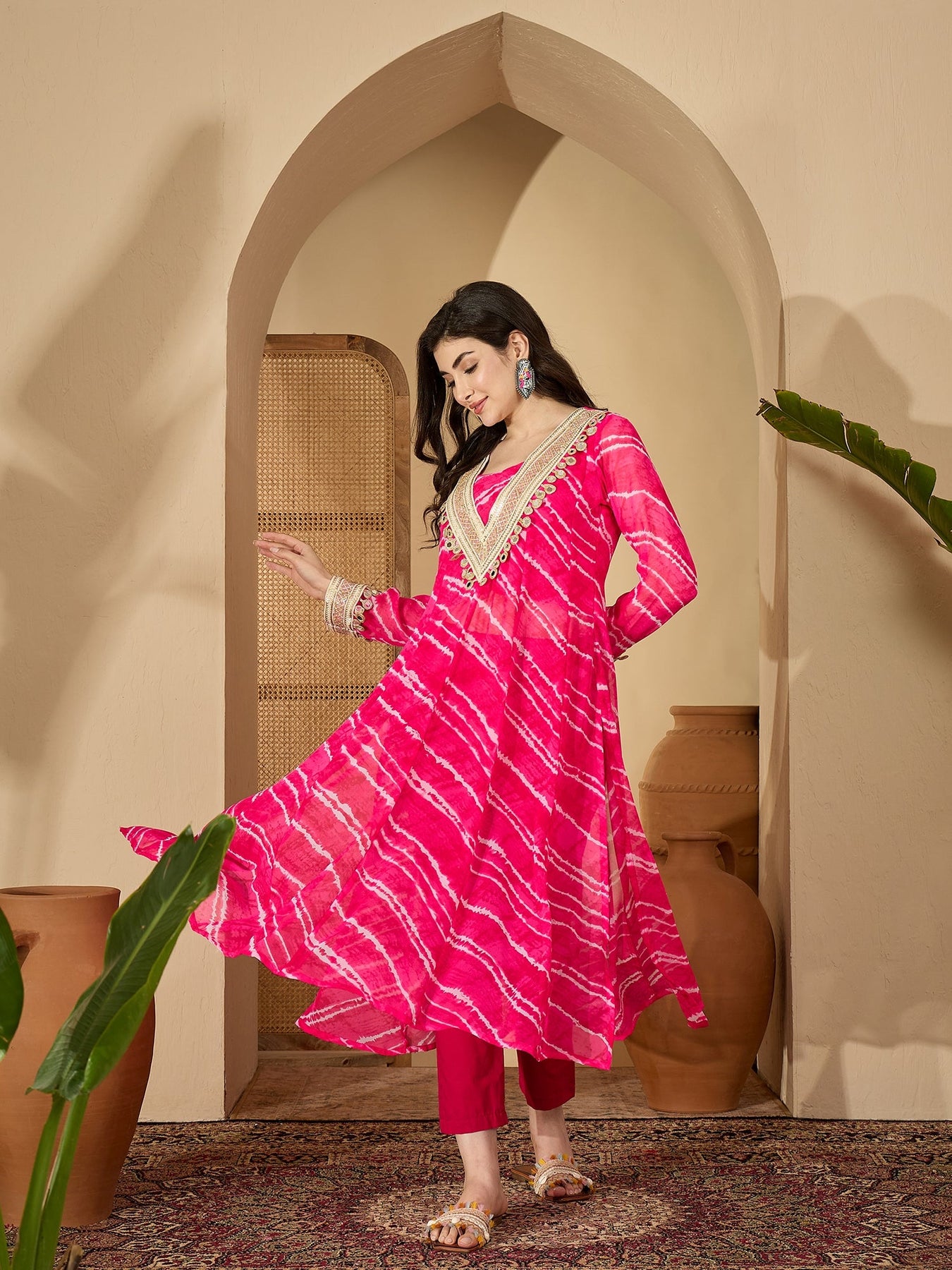 Pink leheriya printed and embroidered georgette a-line kurta pant set. Kurta has v-neck with mirror embroidery on it with it has lining inside. Full sleeves with embroidery on it. Pink solid cotton pant has fully elasticated waistband. Kurta Length- 48'' Inch, Pant Length- 38'' Inch.