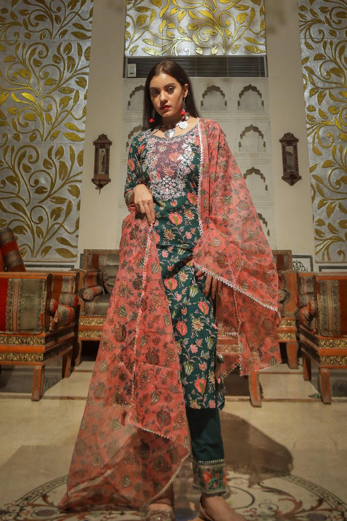 Vibrant Colors Never Fail To Make An Impression, And Our Shades Of Green Suit Set Is Just The Perfect One. The It Has Thread Word on front Round neck and Long Tussles on the Side Slits along With the Solid Pant with Side Pocket, Just makes it Perfect set For Any Outing and doriya Dupatta to add the sheer elegance