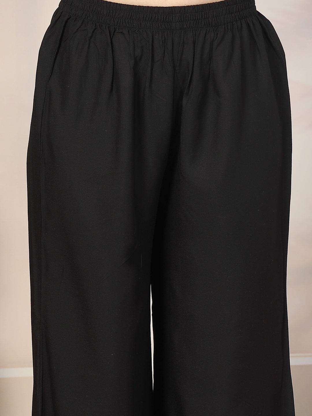 Embrace festive elegance with this black rayon kurta palazzo dupatta set. The kurta features ethnic prints and Pakistani lace on the neckline, sleeves, and hemline. Paired with a solid rayon palazzo adorned with fringe lace and a net embroidered dupatta for a refined finish.