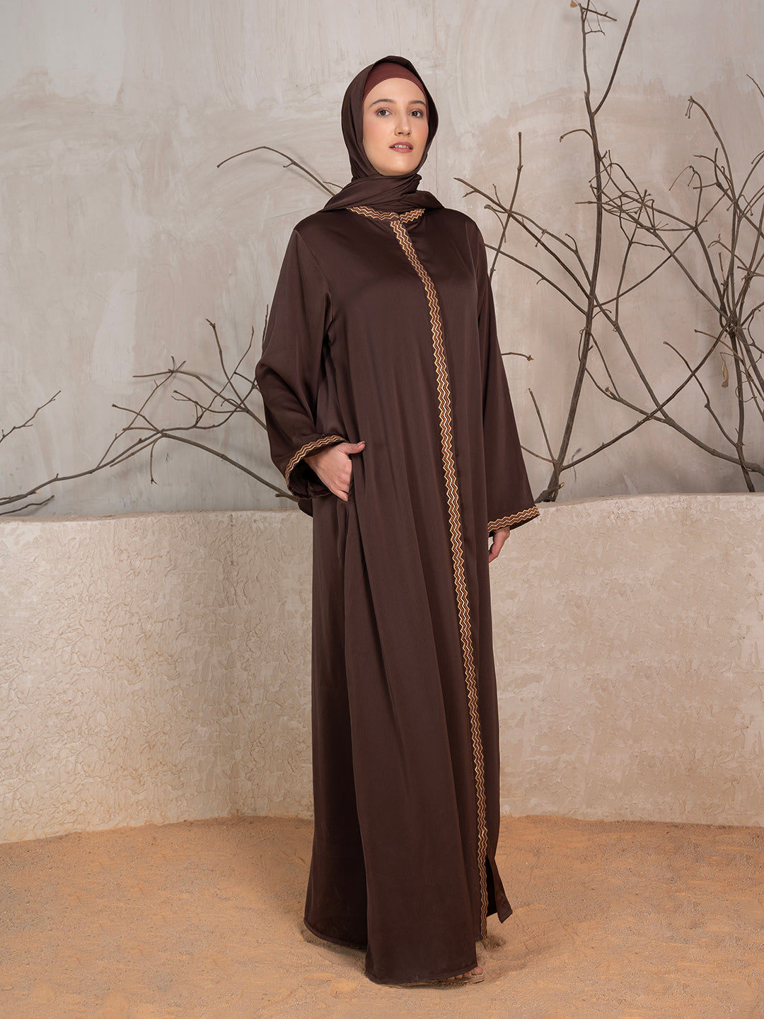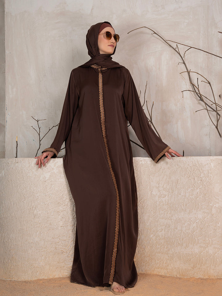 Brown Polyester Tik Tok Fabric Solid Embroidered Abaya With Scarf