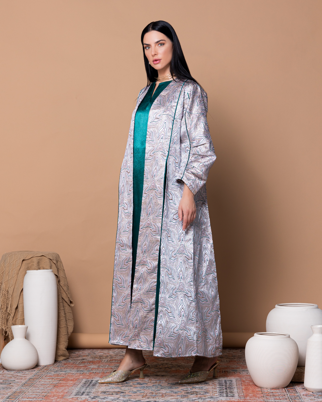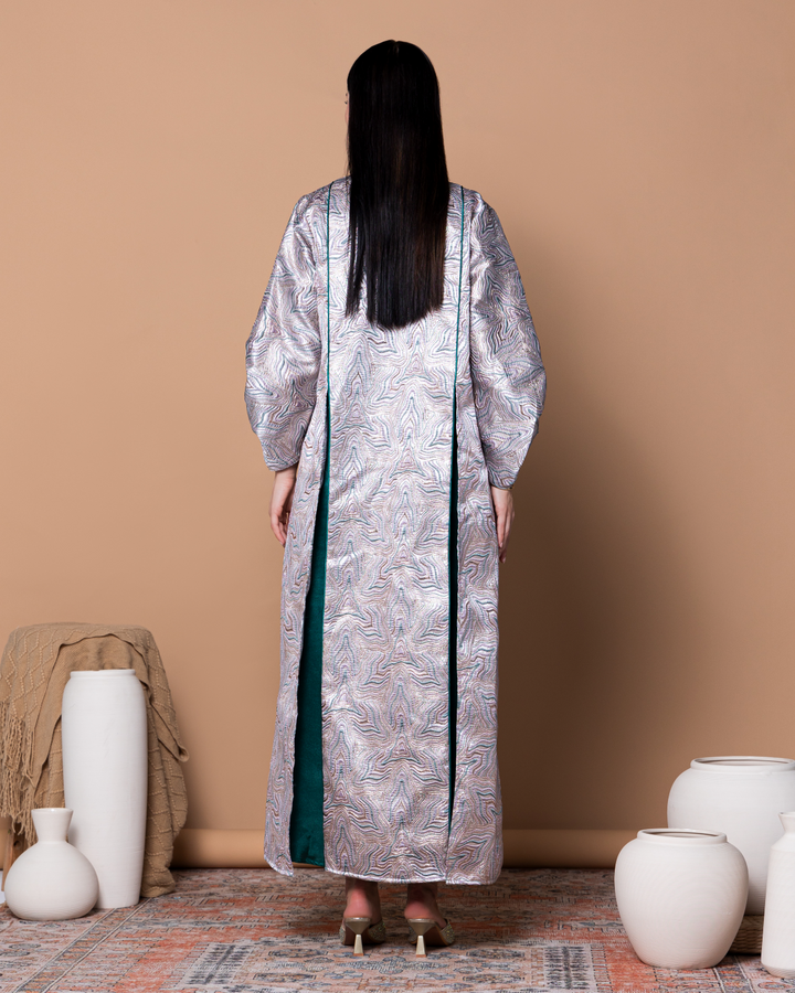 Enjoy Modern Modesty With This Relaxed Abaya Featuring Front And Back Slits Accented By Contrast Piping And Structured Sleeves With Piping Details. Paired With A Sleeveless Inner Dress Featuring A V-Neckline And Tie-Up Belts At The Waist, This Set Offers Comfort And Style For Any Occasion.