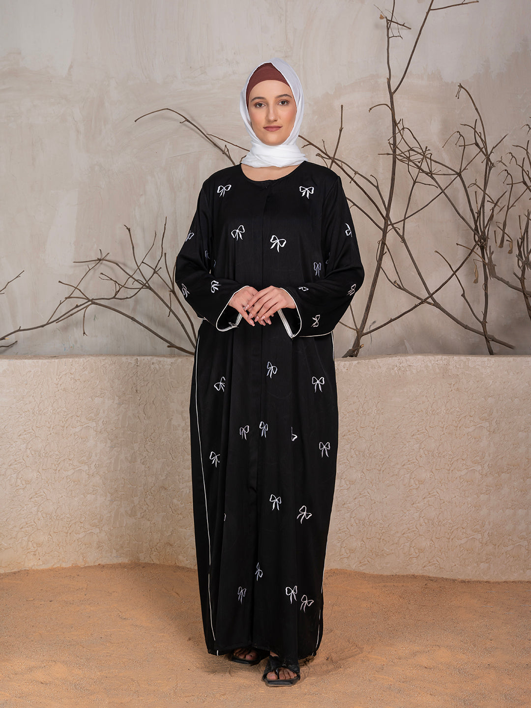 Black Polyester Tik Tok Fabric Bow Embroidered Abaya With Scarf