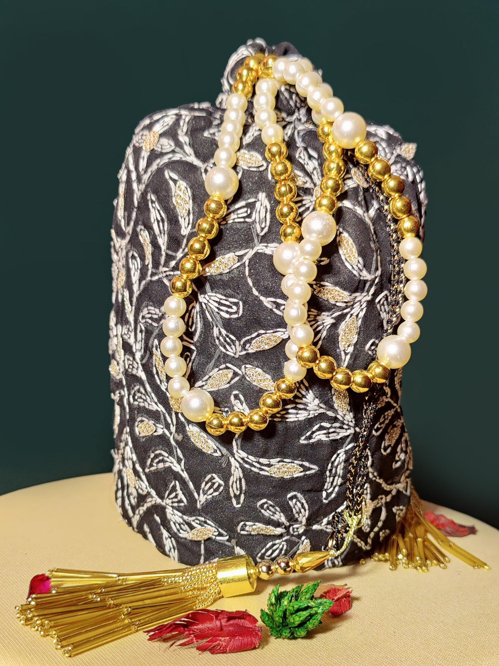 Fabric: Kota Length: 9.5 Inches Width: 8 Inches Color: Black Embroidery: Tepchi Embellishment: Gottapatti Work Thread Color: White & Pink Washing Instructions: Handwash Only