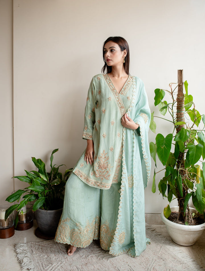 This elegant full set features a crush tissue angrakha kurta adorned with intricate hand embroidery, paired with a beautifully embroidered sharara and a delicate dupatta. The kurta has a stylish V-neckline and three-fourth sleeves, adding to its contemporary appeal. The top has a length of 32 inches, while the bottom, crafted from luxurious silk tissue, measures 40 inches in length. Complementing the ensemble is a graceful organza dupatta, completing the look with sophistication and flair. The blend of tissue and silk tissue fabrics enhances the overall richness of this ensemble, making it perfect for special occasions.