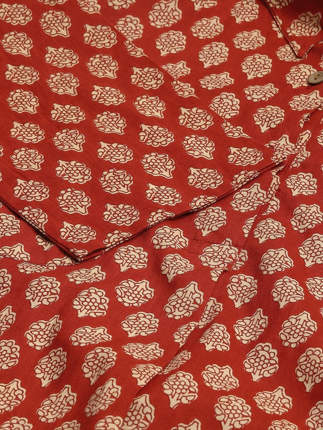 Stay Stylish This Summer With A Maroon Cotton Shirt-Style Kurta Featuring Ethnic Motifs And Patch Pockets. Paired With Hem-Cuffed Trousers, This Set Offers Comfort And A Casual-Chic Look. Specifications Color: Maroon | Neck: Shirt Collar | Print: Ethnic Motifs | Hemline: Curved | Sleeve: Long Regular | Slit: Side Slits | Kurta Length: Above Knee | Top Fabric: Pure Cotton | Bottom Fabric: Pure Cotton | Bottom Type: Harem Pant | Dupatta: Not Included