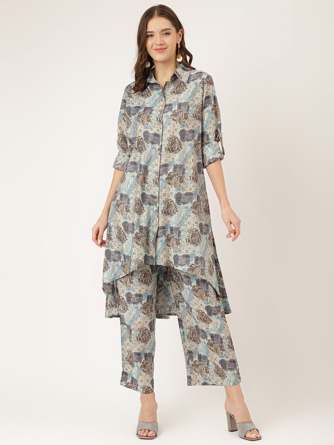 This Kurta Set consists of a Kurta and trousers . Blue dyed Kurta, has shirt collar, Fold sleeves and button closure. Blue dyed trousers, has an elasticated waistband with slip-on closure Co-ord-Set for Formal and Informal Gatherings.