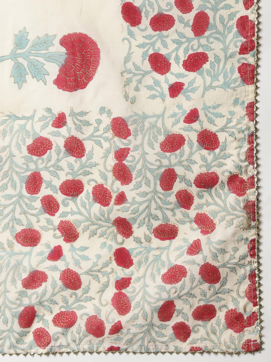 This Cream Chanderi Anarkali Exudes Elegance With Delicate Patch Work And Subtle Sequin Highlights. Paired With Solid Trousers And A Matching Dupatta For A Soft, Graceful Festive Look. Specifications Color: Cream | Neck: V-Neck | Print: Floral | Hemline: Curved | Sleeve: Three-Quarter Regular | Slit: None | Kurta Length: Calf Length | Top Fabric: Chanderi | Bottom Fabric: Pure Cotton | Bottom Type: Trouser | Dupatta: Included