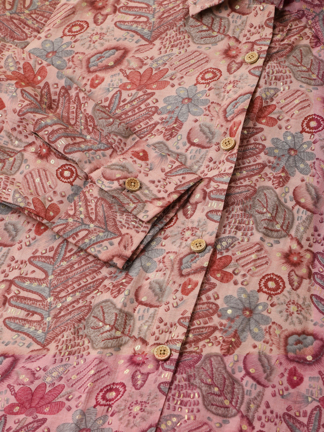 This Kurta Set consists of a Kurta and trousers . Purple Foil Printed Kurta, has shirt collar, Fold sleeves and button closure. Purple Printed trousers, has an elasticated waistband with slip-on closure Co-ord-Set for casual Gatherings.