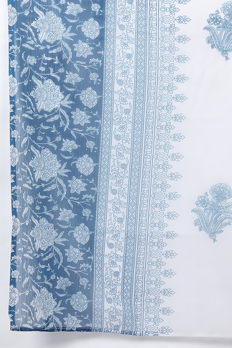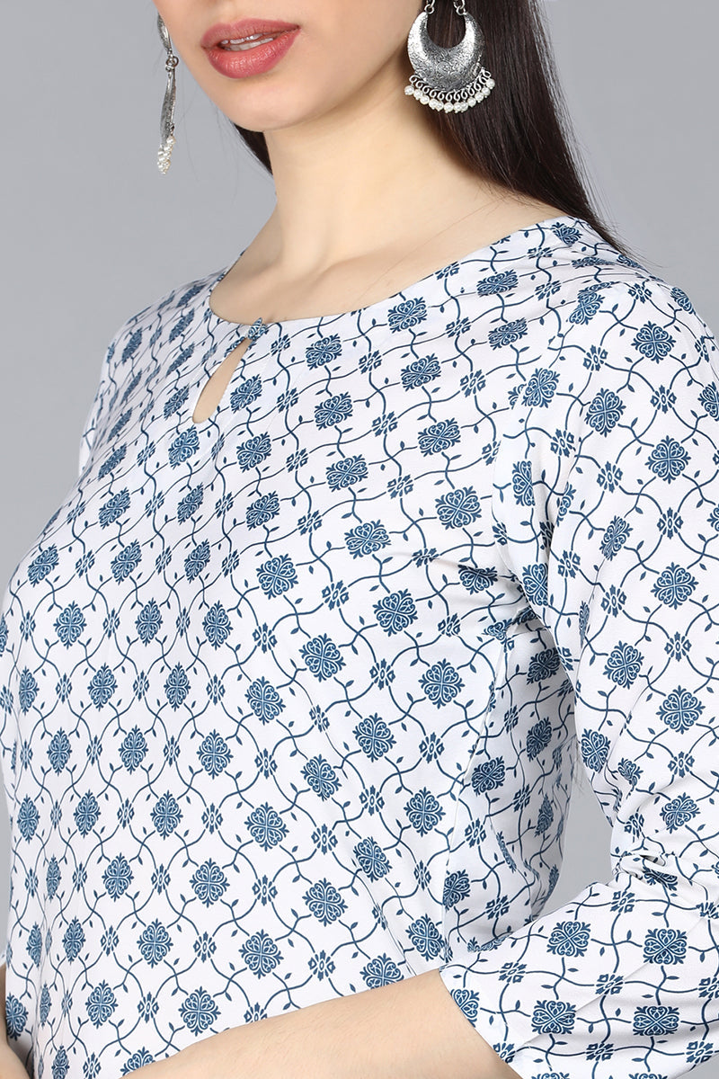 This white poly crepe kurta set features refined ethnic motif prints with an elegant A-line silhouette, offering a graceful and comfortable option for everyday wear.