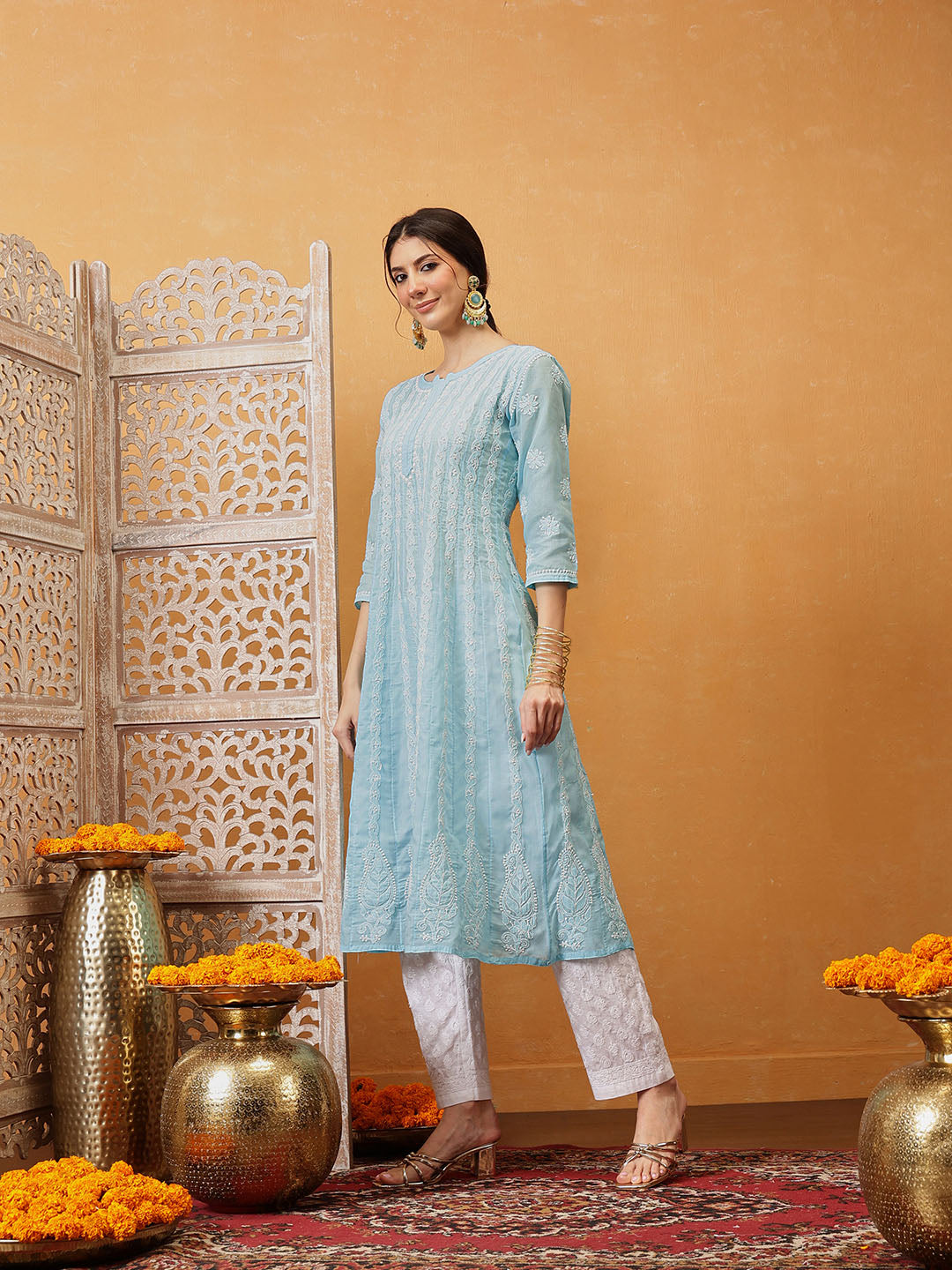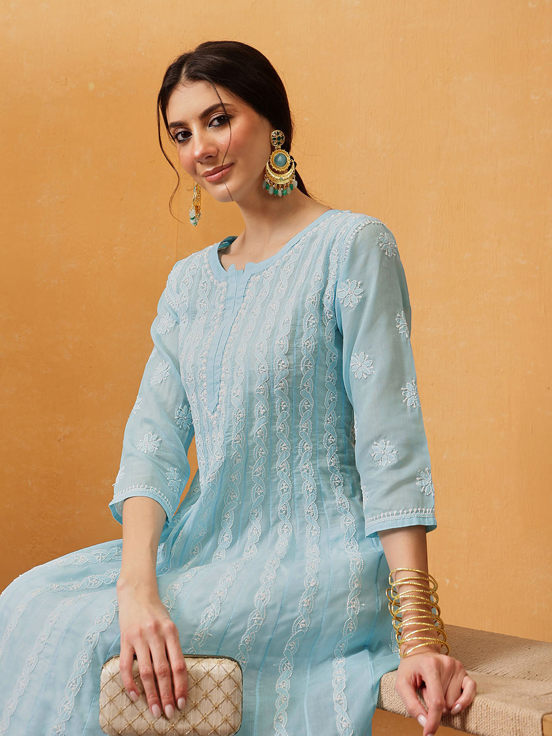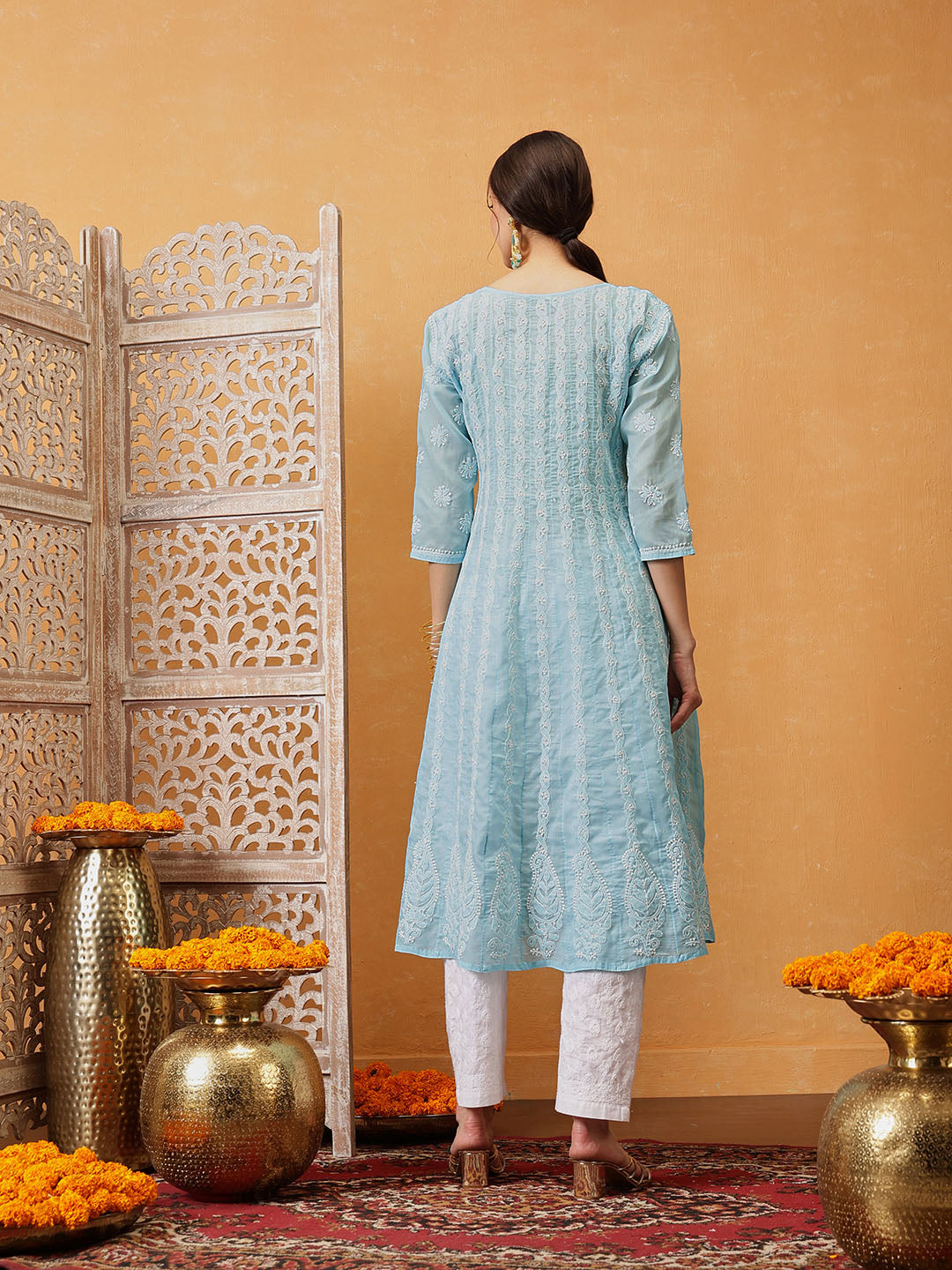 Hand Embroidered Lucknowi Chikankari Blue Anarkali A-line Cotton Kurta