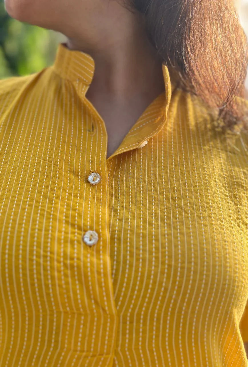 Crafted In Airy Kantha Cotton, This Yellow Kurta Set Features A Smart Collar Neckline With Pearl Button Detailing. The Gathered Bottom Enhances The Flowy Silhouette, Making It A Stylish Pick For Casual Comfort. Features: Top Fabric: Pure Cotton Bottom Fabric: Pure Cotton Top Length: 43" Bottom Length: 35" Sleeve Type: Short Sleeves