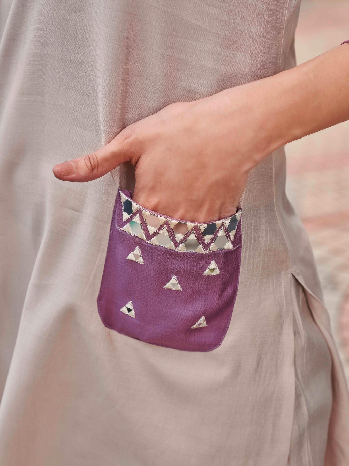 Elevate Your Casual Style With This Beige And Taupe Silk Blend Co-Ord Set. The V-Neck Top Features Three-Quarter Sleeves And Intricate Mirror Patchwork Embroidery, Paired With Solid Silk Blend Trousers. Fully Lined And Ready To Wear, This Set Is Perfect For Casual Occasions Or Gifting.