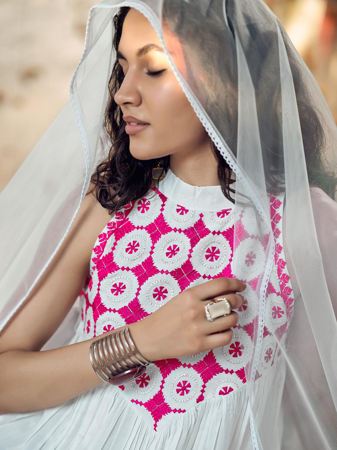 Step Into Festive Style With This White Rayon Kurta Set. The Halter Neck, Pleated A-Line Tunic Is Floor-Length With Exquisite Yoke Embroidery, Paired With Solid Rayon Trousers And A Net Dupatta With Taping Border. This Ready-To-Wear Ensemble Offers Comfort And Elegance For Special Celebrations.