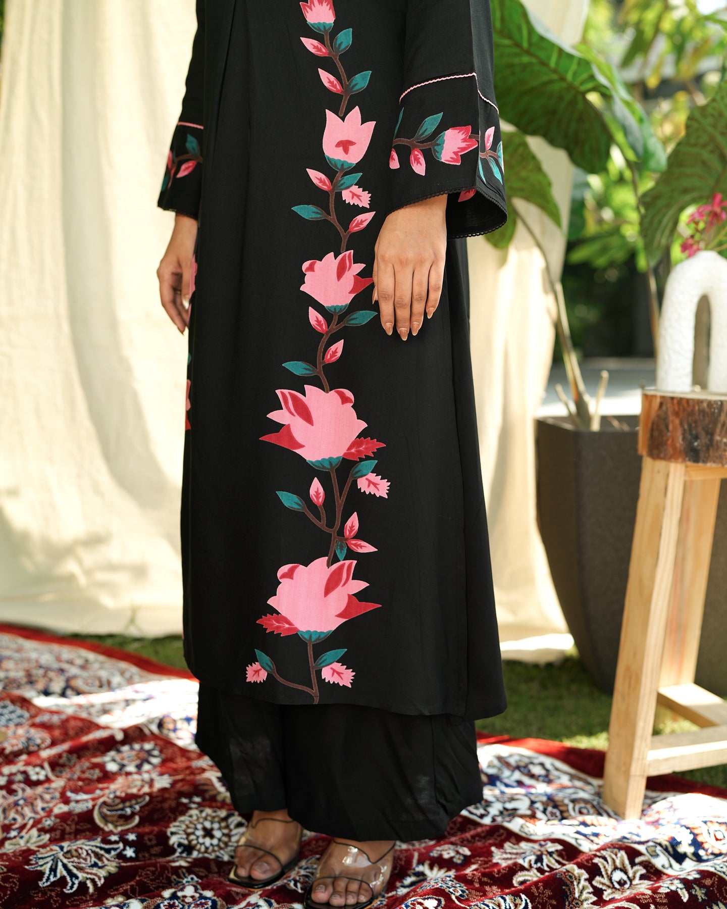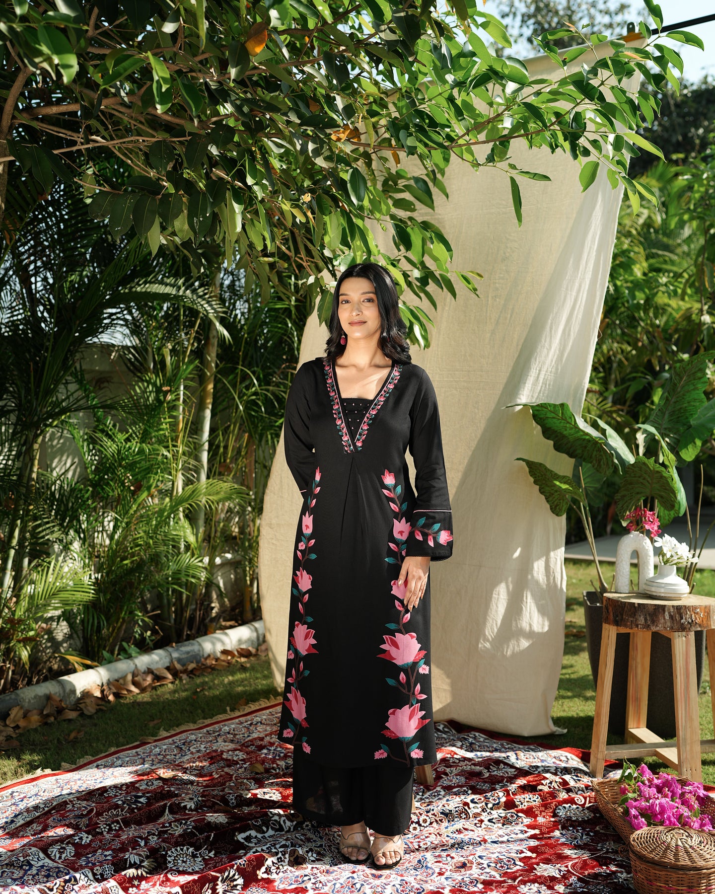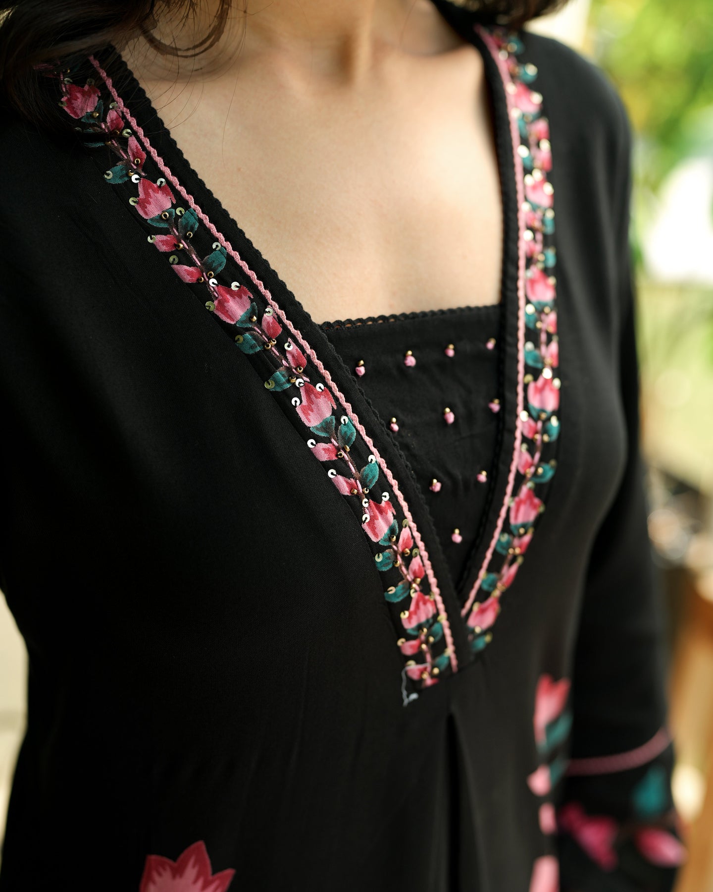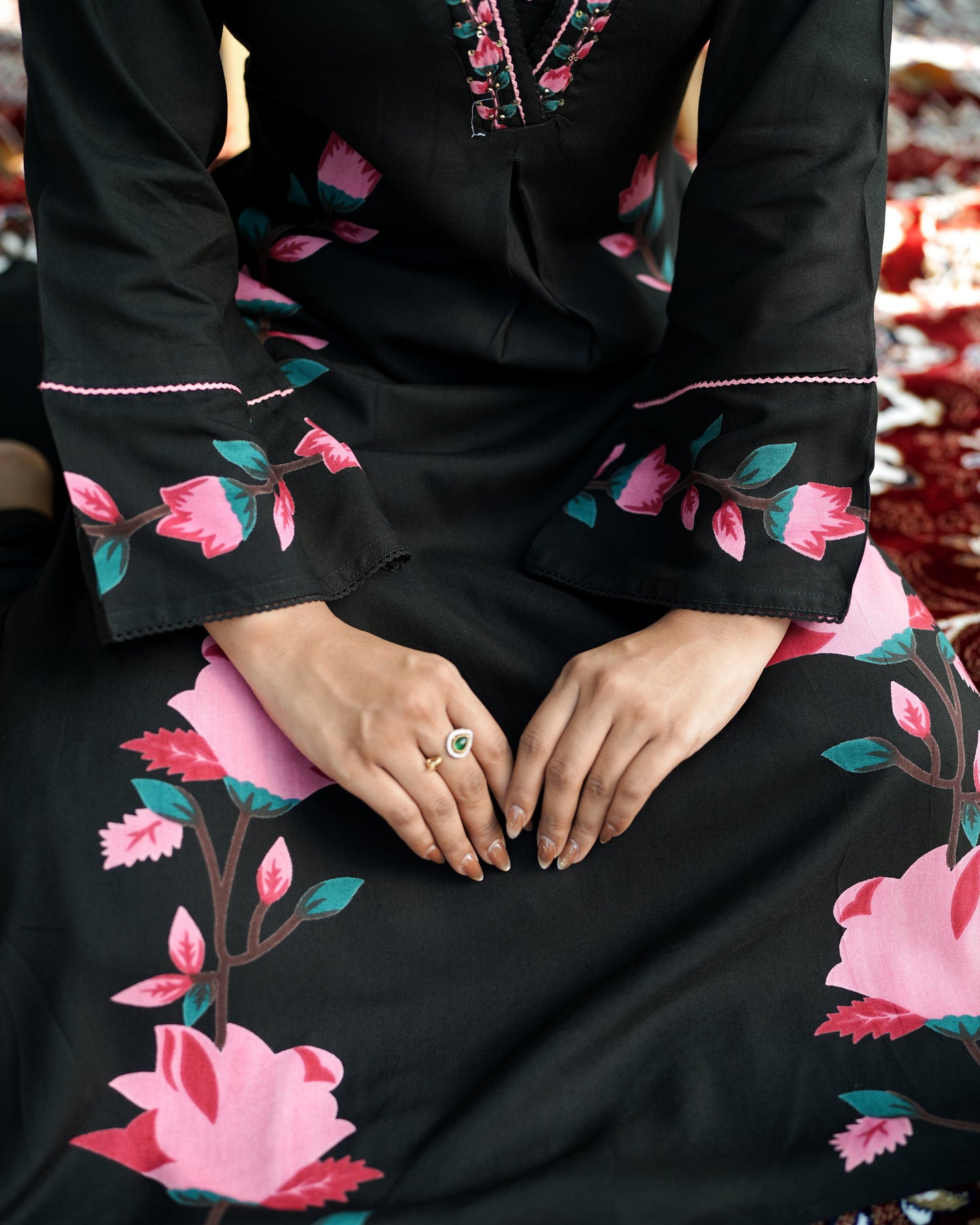 This black cotton kurti is designed for comfort with a graceful ethnic look. The soft, breathable fabric feels light on the skin and is perfect for all-day wear. Delicate floral work adds a subtle pop of color and elegance to the kurti. Ideal for casual outings, office wear, or festive daytime occasions.