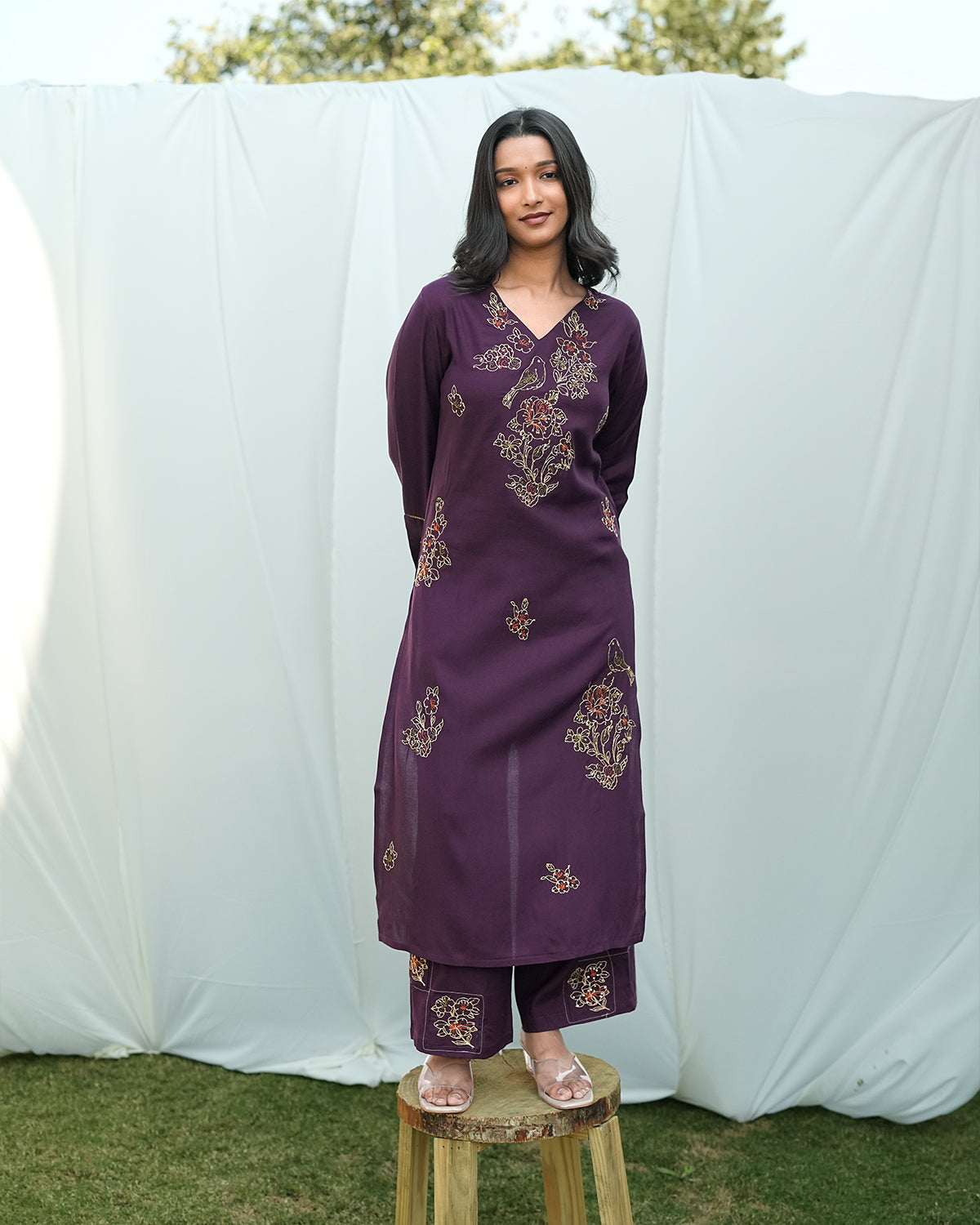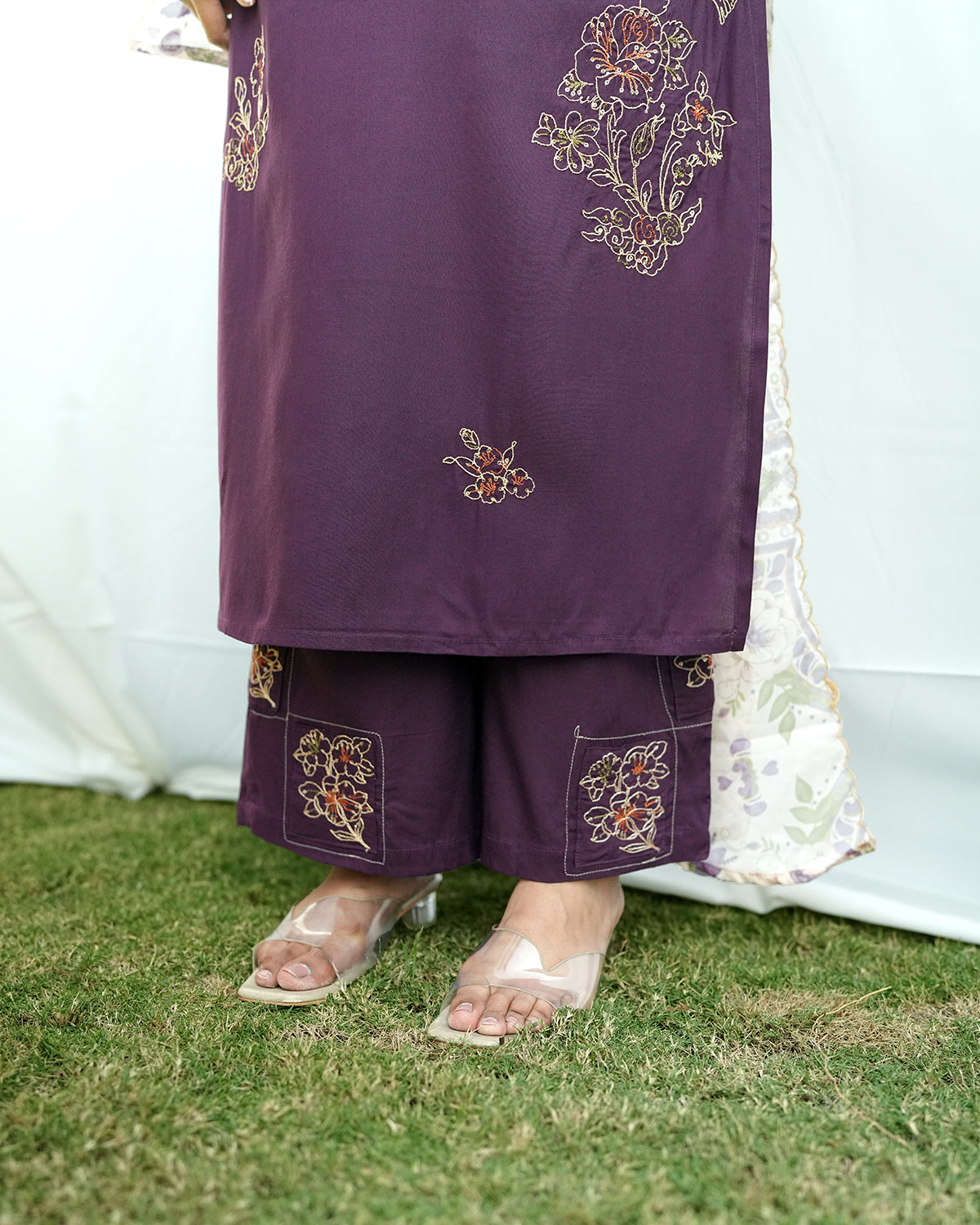 Wine Embroidered Kurti Palazzo Set With Dupatta