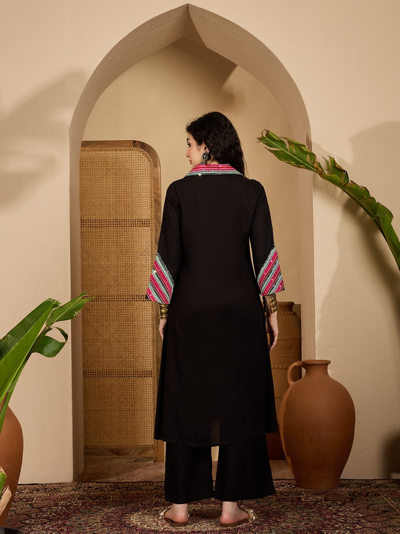 Black solid rayon a-line kurta pant set. Kurta has shirt collar with fancy buttons & embroidery on it, 3/4th flared sleeves with havy embroidery. Black solid rayon pant has half elasticated waistband with one side pocket. Kurta Length- 48'' Inch, Pant Length- 38'' Inch.
