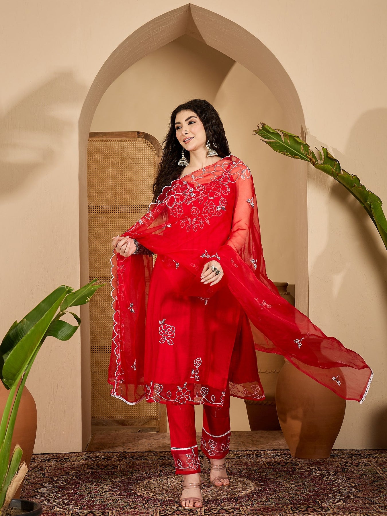 Red Solid & Embroidered Organza Straight Kurta Pant Dupatta Set