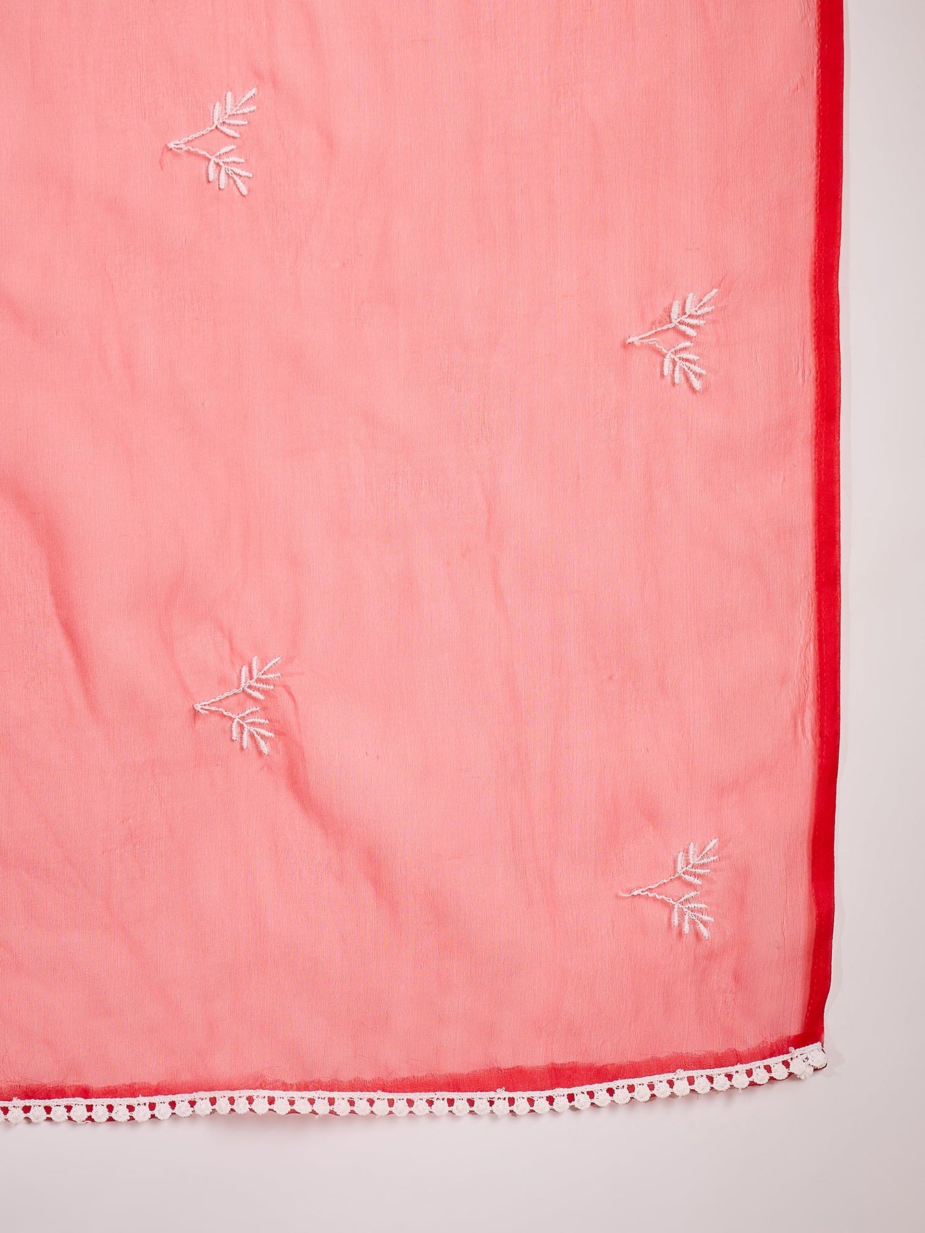 Red embroidered organza straight kurta pant dupatta set. Kurta has round neck with embroidery on yoke & lace border details on it & shoulder straps. Red solid cotton blend pant has fully elasticated waistbend. Paired with organza embroidery dupatta with tapping border. Kurta Length- 45'' Inch, Pant Length- 38'' Inch, Dupatta Length- 2.30 Mtr.