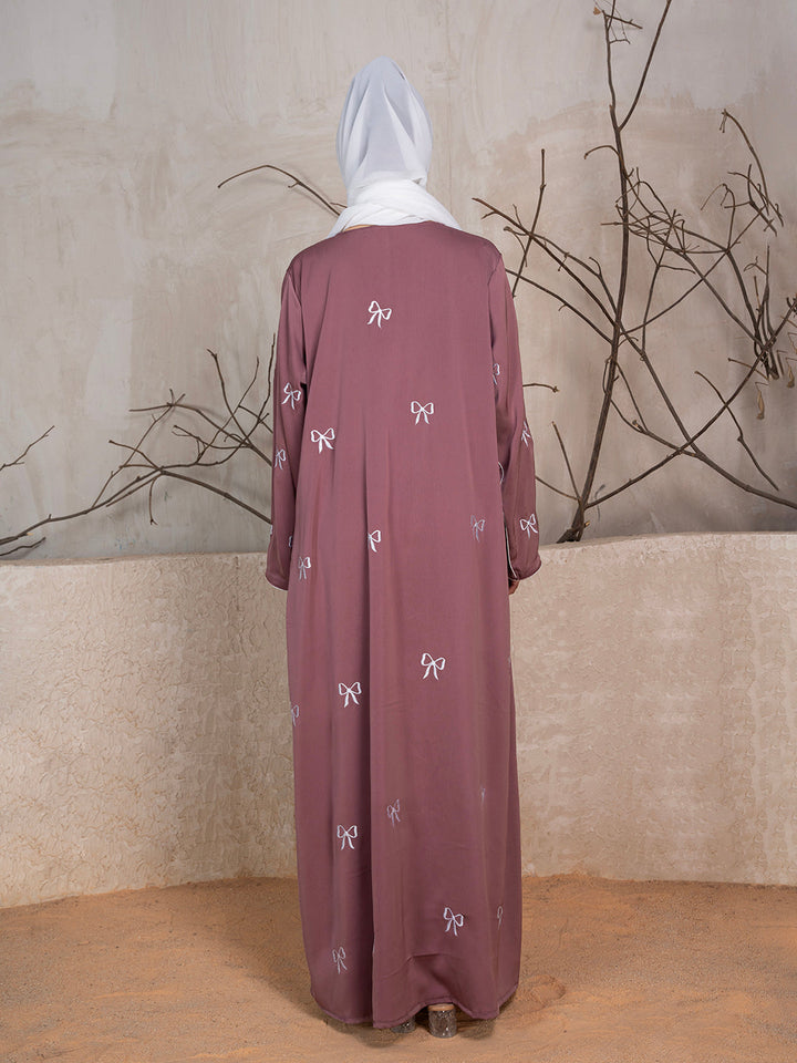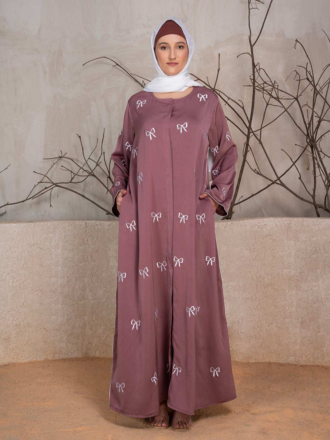 Enhance Your Modest Wardrobe With This Elegant Embroidered Abaya Burqa with Scarf. Crafted From High-Quality 100% Polyester Fabric, This Abaya Ensures Both Comfort And Durability. The Soft And Breathable Material Is Perfect For All-Day Wear, Keeping You Stylish And At Ease. This Abaya Features A Sophisticated Mauve Tone With Delicate White Bow Motifs Embroidered Across The Front And Sleeves, Adding A Charming And Feminine Touch. It Comes With A Round Neckline And Long, Relaxed-Fit Sleeves With Piped Edges For A Polished Look. The Flowy, Loose-Fitting Design Provides Ample Coverage And Ensures Comfortable Movement. Side Pockets Add A Touch Of Practicality. Perfect For Casual Outings, Evening Gatherings, Or Daily Wear, This Embroidered Abaya Blends Modesty With Contemporary Style, Making It A Versatile Choice For Any Occasion.