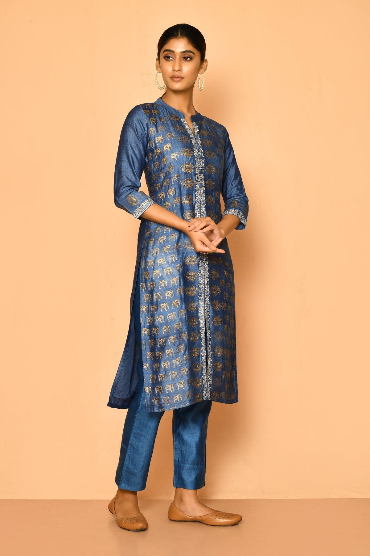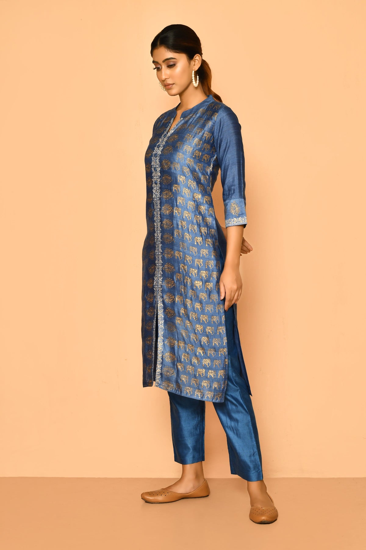 This timeless yet cheerful set is handcrafted in luxurious cotton silk fabric with soft cotton lining and is designed to stand out and yet keep you comfortable. A poetic expression of hand block print on rich peacock blue color shade, makes it a must have wardrobe staple. Featuring mandarin collar, 3/4th sleeves and high side slits on either side give you an edgy monochromatic look. Dress it up or down with other pieces in your wardrobe to create several looks.
