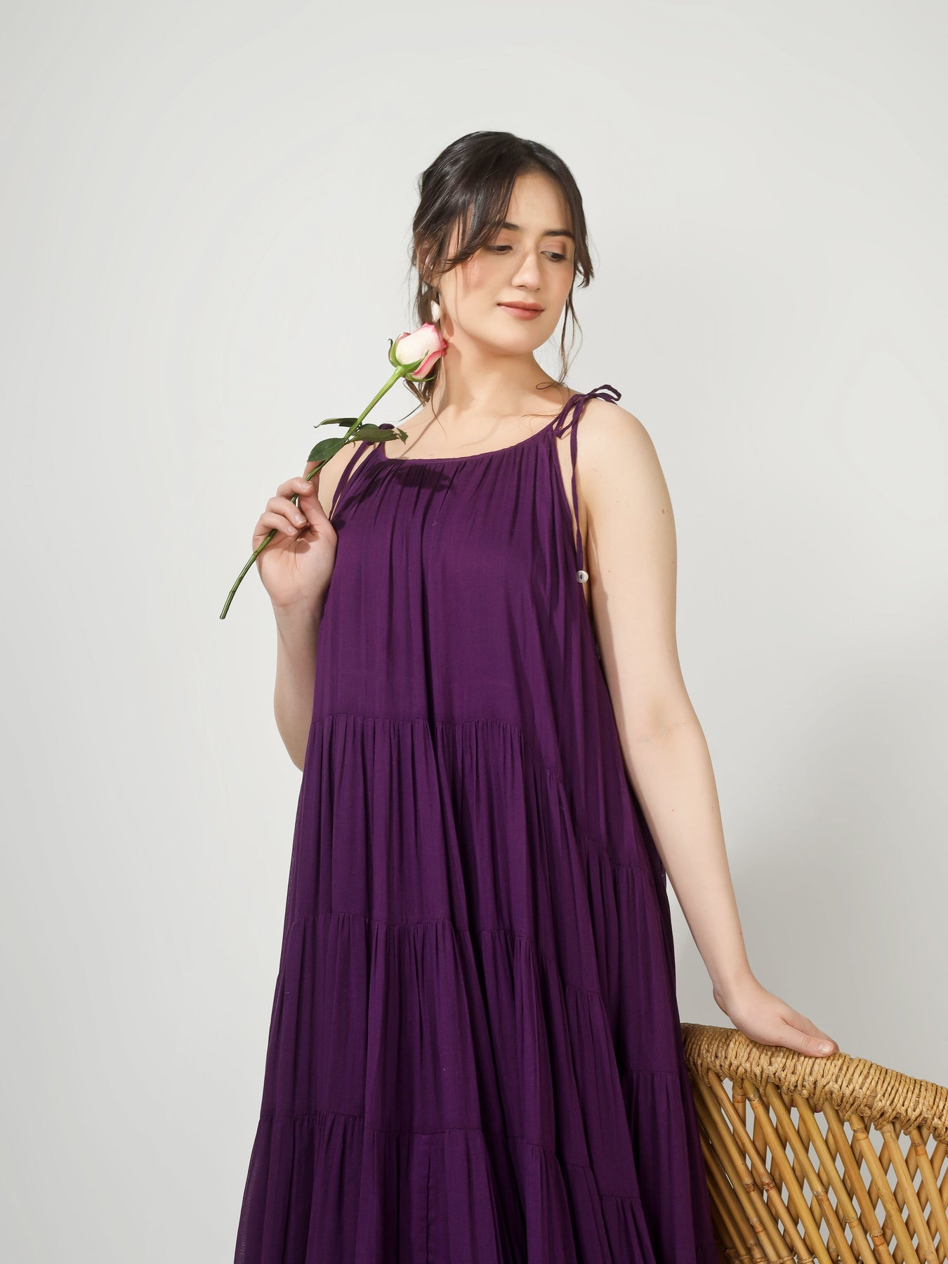 This ankle-length dress features adjustable shoulder tie-ups for a custom fit, a flattering strappy neckline, and gathered multi-tier layers. Style it with minimal jewelry for festive brunches or relaxed daytime celebrations.