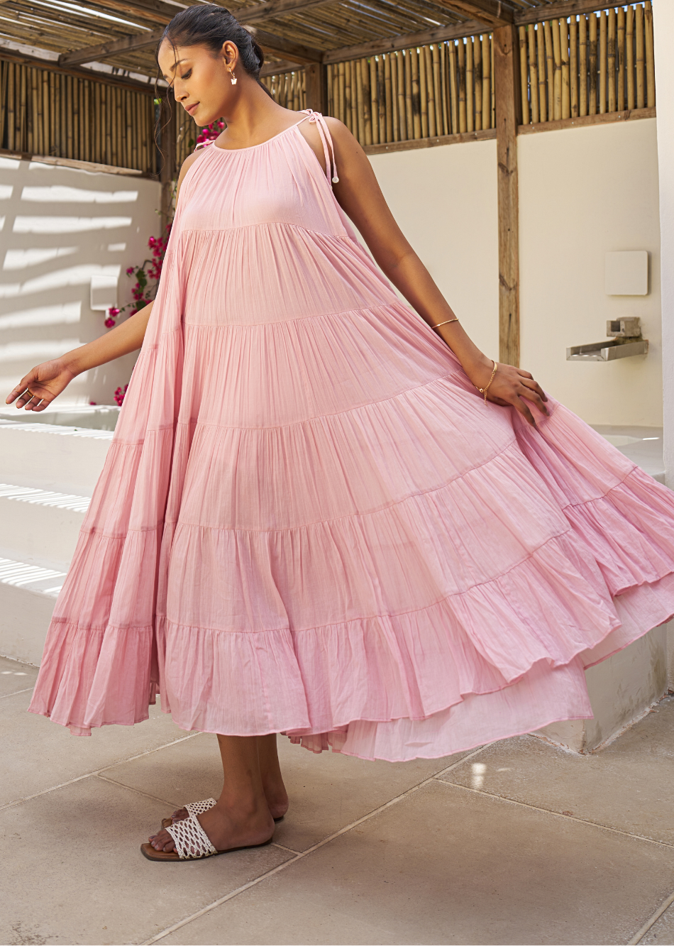 This full -length dress has strappy shoulder tie-ups, gathers, in multi-tiered layers, creating a graceful flare.