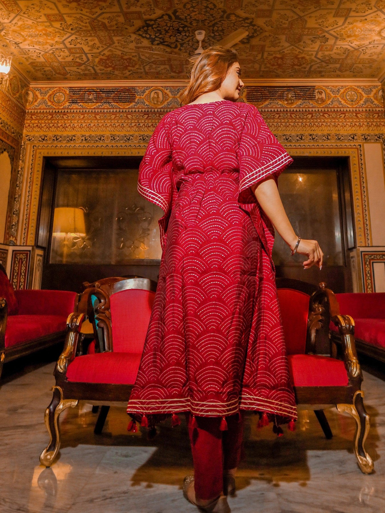 A Stylish Maroon Bandhej Kaftan With Sequins, Tassel Accents, And Gota Patti Work. Paired With Cotton Pants, This Set Blends Ethnic Charm With A Relaxed Silhouette, Ideal For Festive And Everyday Wear.