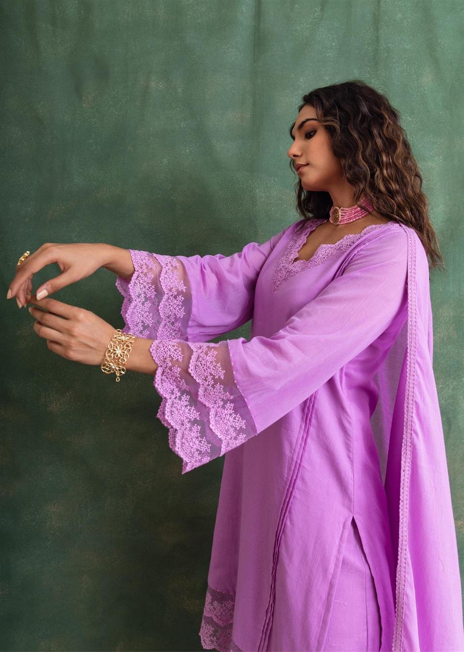 Drape Yourself In Understated Elegance With Our Mauve Anti-Fit Kurta Set. The V-Neck Kurta Features Pintucks, Loose Sleeves With Double Lace Detailing And Moti Embellishments. Paired With Straight Pants, The Ensemble Is Completed With An Odhni Adorned With Delicate Detailing And Lace On The Edges, Presenting A Perfect Blend Of Comfort And Elegance.