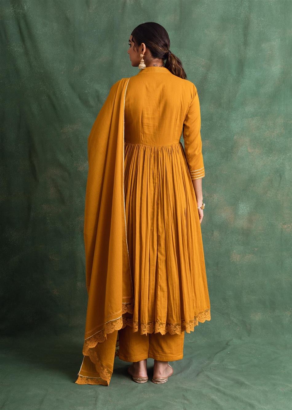 Experience Subtle Glamour In Our Honey Yellow Suit Set. The Deep V-Neck Kurta Features A Cross-Gather Pattern, Intricate Lace, And Meticulous Hand Embroidery With Bead Adornments. The Full-Sleeved Anarkali Radiates Elegance With Lace Accents, Bead Embellishments, And A Front Knot Adorned With Handmade Tassels. Paired With Lace-Edged Pants And A Hand-Embroidered Dupatta.