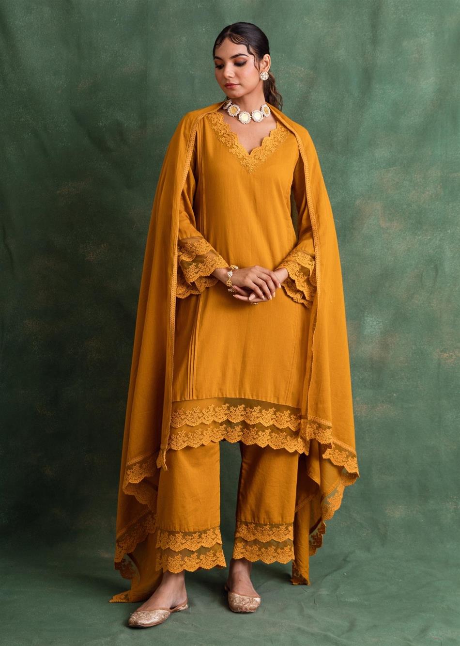 Wrap Yourself In Refined Grace With Our Mustard Anti-Fit Kurta Set. The V-Neck Kurta Boasts Pintucks, Loose Sleeves Adorned With Double Lace Detailing And Moti Embellishments. Paired With Straight Pants, The Ensemble Is Perfected With A Chunni Featuring Delicate Detailing And Lace Edges,Comfort And Elegance For A Flawless Look.