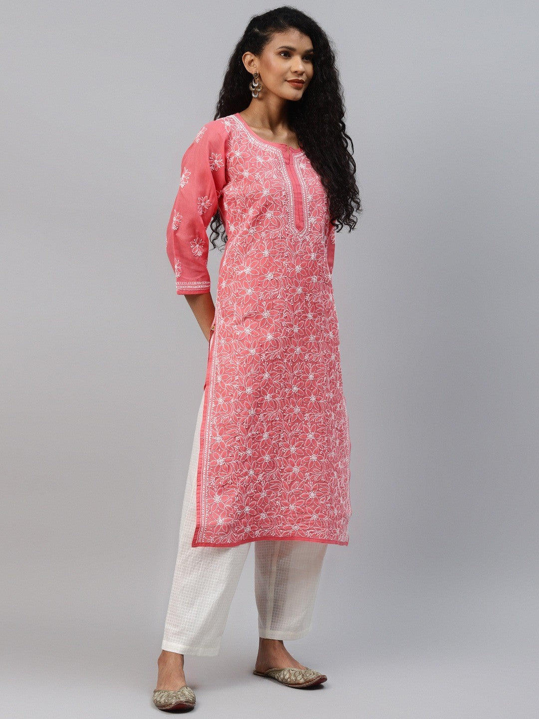 Carrot Pink Cotton Chikan Kurta Offers A Comfortable And Relaxed Silhouette To The Wearer, The Fabric And Embroidery Is Skin Friendly, Has A Round Neck, Three-Quarter Sleeves, Straight Hem, Side Slit