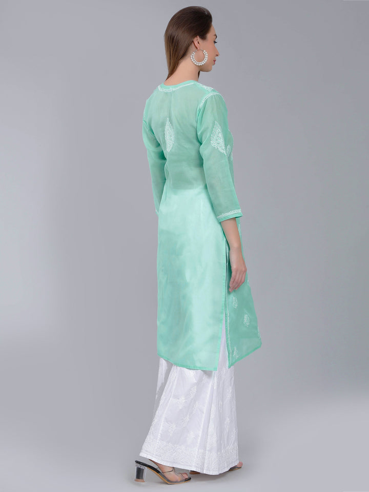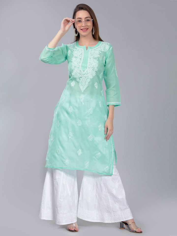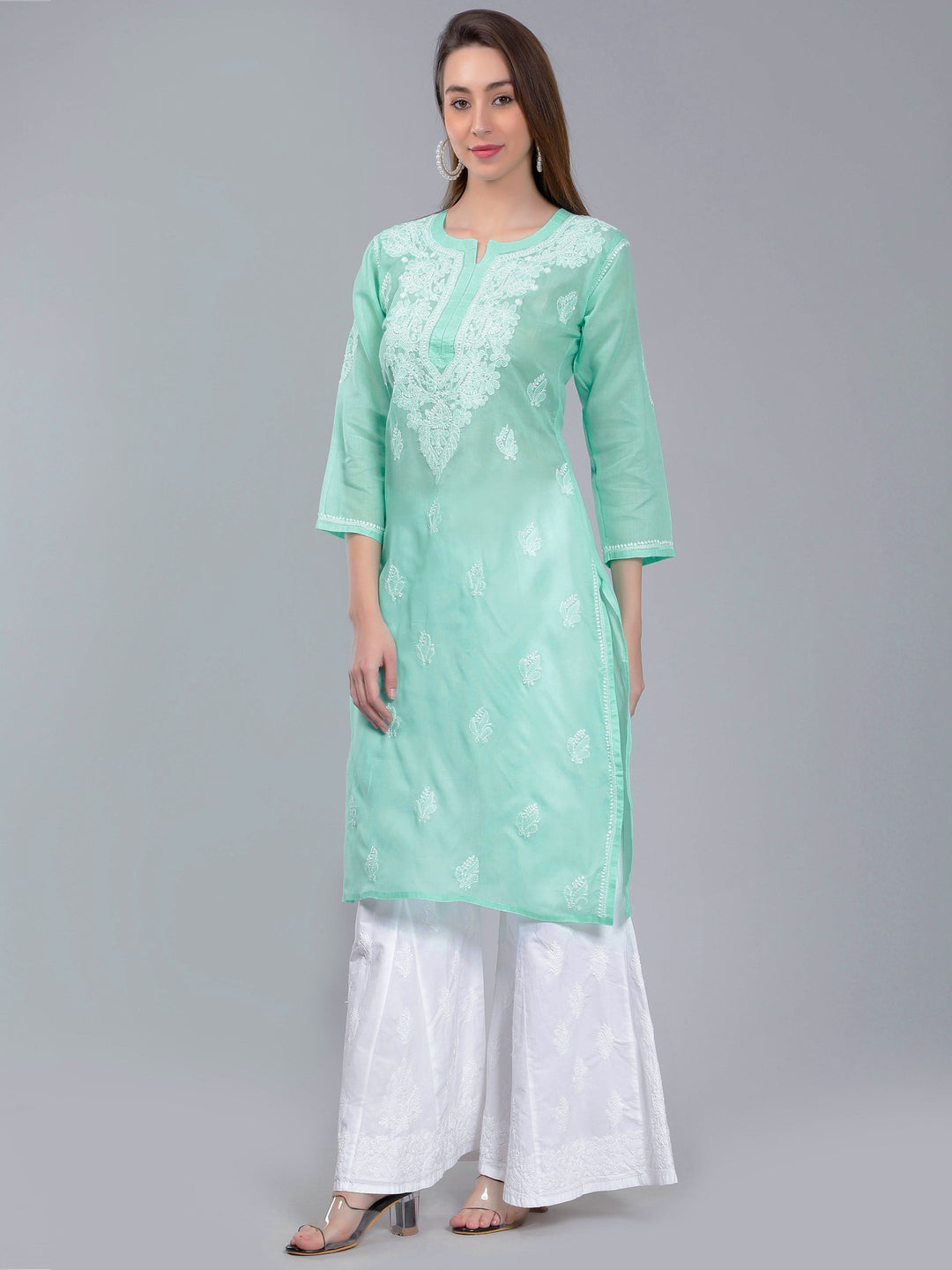 This Mint Green Colored Cotton Straight Chikankari Kurta is 100% handcrafted readymade prewashed kurta (washed multiple times so as to avoid color bleeding and shrinkage of the product). The Kurta features a round neckline, three-fourth regular sleeves, cotton fabric, 45 Inches straight long calf-length finish along with straight hems, the back and sleeves of the kurta are decorated with loosely scattered motifs while the front of the chikankari kurta is enhanced with dense embroidered neck and motifs in the form of Ghaspatti & Phanda white delineated cotton threadwork.