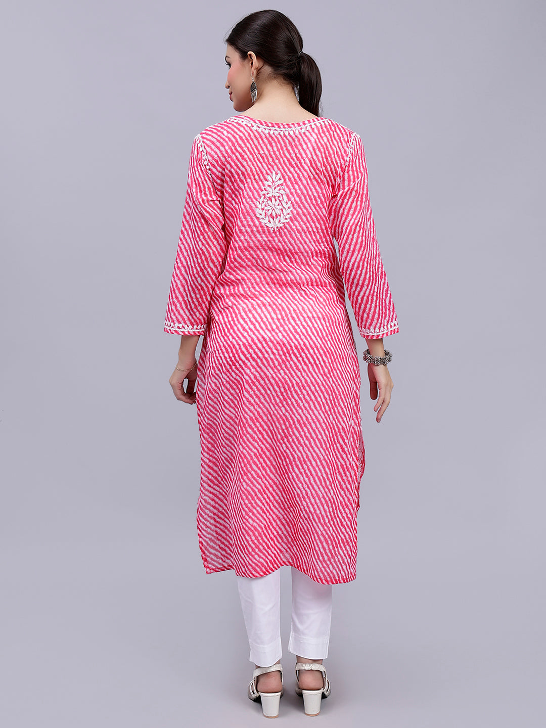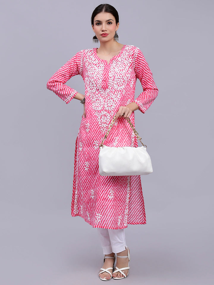 Length: 45 Inches Neck: Round Shape Sleeves: 3/4Sleeves Slit Detail: SideSlit Color: Pink Embroidery: Ghaspatti & Phanda Thread Color :White Washing Instructions: Handwash Only Disclaimer: There may be some minor dissimilarities in crafting andEmbroidery than showcase image. Since it is handcrafted product and these minor differences are natural when the crafting procedure has human involvement. However, these crafting changes are beautiful likewise show uniqueness. Note: Product maybe altered down by one size if required. For instance, size 40 can be altered to size 38.