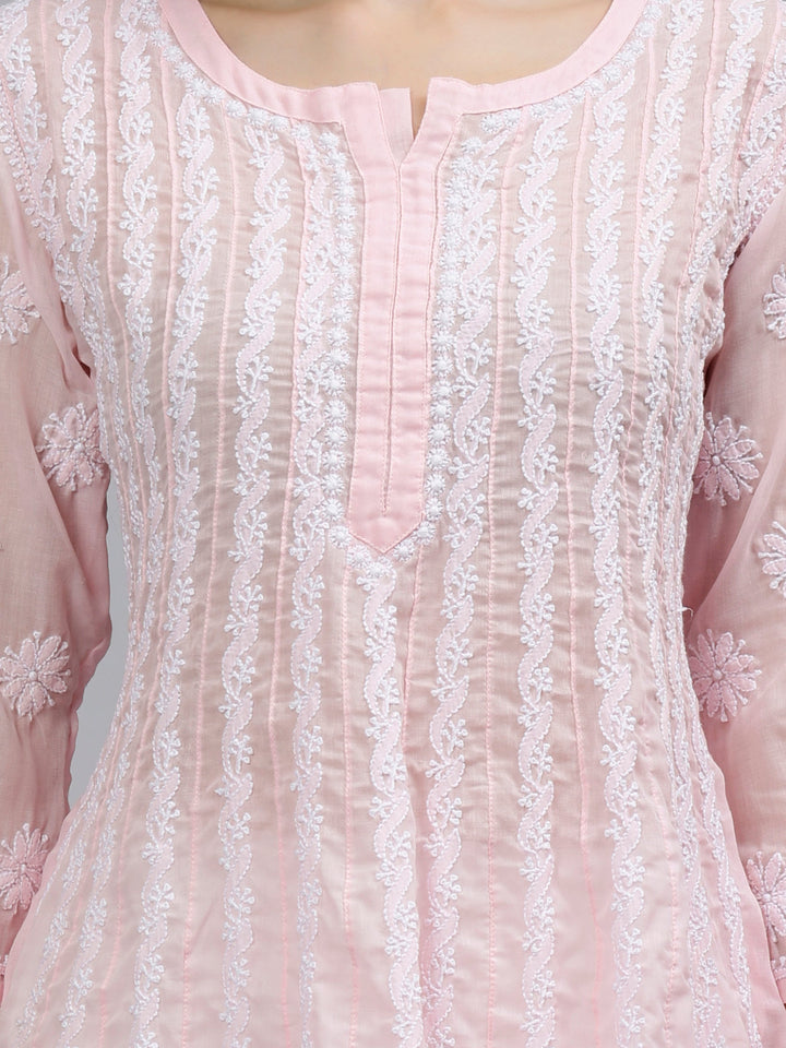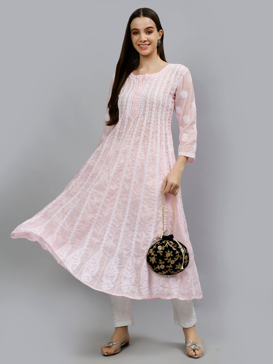 This is a Pink Terivoil Hand Embroidered Chikankari Anarkali Kurti Following are the features of this product:- Length: 45 Inches Neck: Round Shape Sleeves: 3/4 Sleeves Slit Detail: Flared Embroidery: Ghaspatti & Phanda Thread Color: White Delineation: Purchase this elegant and comfortable black chikan kurti online from ZERESOUQ, is ideal for any fashionista. It has beige-coloured rich and attractive chikan embroidery. Buy this classic kurti for any occasion, any festival and any party celebrations. Disclaimer: There may be some minor dissimilarities in crafting and embroidery than showcase image. Since it is handcrafted product and these minor differences are natural when the crafting procedure has human involvement. However, these crafting changes are beautiful likewise show uniqueness. Note: Product maybe altered down by one size if required. For instance, size 40 can be altered to size 38.