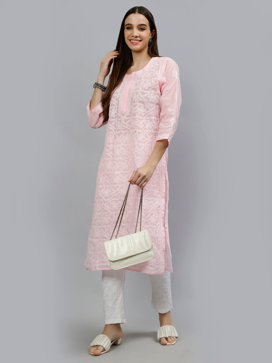 This is a Pink Terivoil Hand Embroidered Lucknowi Chikankari Kurti Following are the features of this product:- Length: 45 Inches Neck: Round Shape Sleeves: 3/4 Sleeves Slit Detail: Straight Embroidery: Ghaspatti & Phanda Thread Color: White Delineation: Purchase this elegant and comfortable black chikan kurti online from ZERESOUQ, is ideal for any fashionista. It has beige-coloured rich and attractive chikan embroidery. Buy this classic kurti for any occasion, any festival and any party celebrations. Disclaimer: There may be some minor dissimilarities in crafting and embroidery than showcase image. Since it is handcrafted product and these minor differences are natural when the crafting procedure has human involvement. However, these crafting changes are beautiful likewise show uniqueness. Note: Product maybe altered down by one size if required. For instance, size 40 can be altered to size 38.