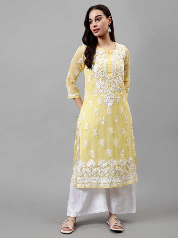 This is a Yellow Georgette Embroidered Chikankari Kurta with Slip Following are the features of this product:- Length: 45 Inches Neck: Round Shape Sleeves: 3/4 Sleeves Slit Detail: Straight Embroidery: Ghaspatti & Phanda Thread Color: Red Delineation: Purchase this elegant and comfortable black chikan kurti online from Seva, is ideal for any fashionista. It has beige-coloured rich and attractive chikan embroidery. Buy this classic kurti for any occasion, any festival and any party celebrations. Disclaimer: There may be some minor dissimilarities in crafting and embroidery than showcase image. Since it is handcrafted product and these minor differences are natural when the crafting procedure has human involvement. However, these crafting changes are beautiful likewise show uniqueness. Note: (1) Product maybe altered down by one size if required. For instance, size 40 can be altered to size 38. (2) This is a transparent product and it includes a Matching Inner Slip.