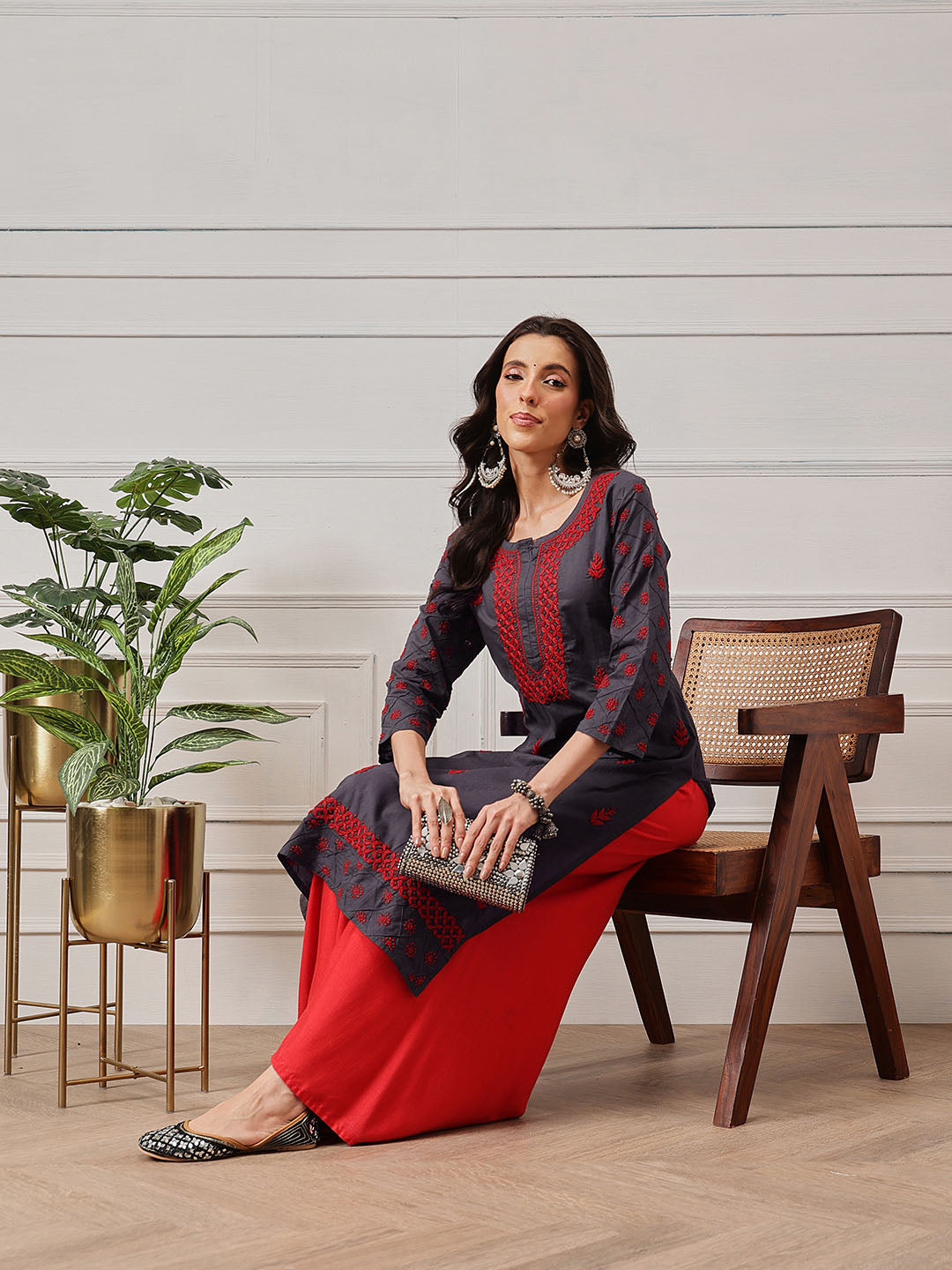 Hand Embroidered Lucknowi Chikankari Grey & Red Cotton Kurta - A411148