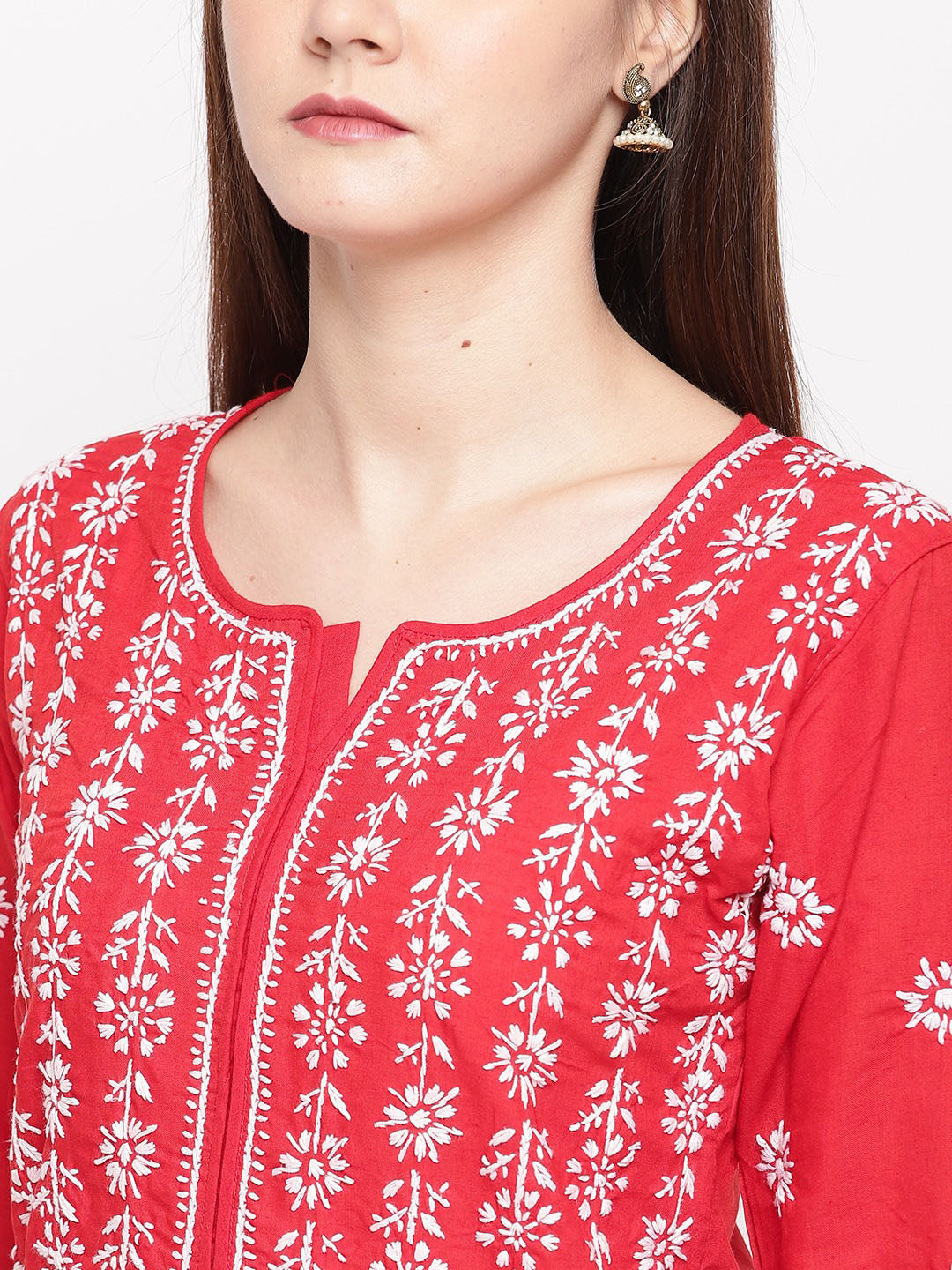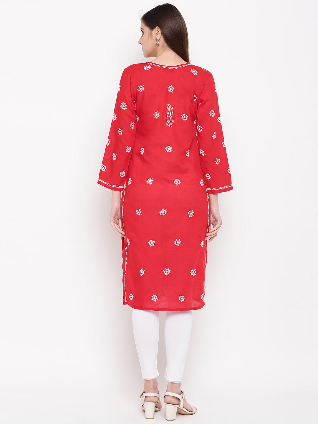 Hand Embroidered Lucknowi Chikankari Red & White Cotton Kurta - A100294