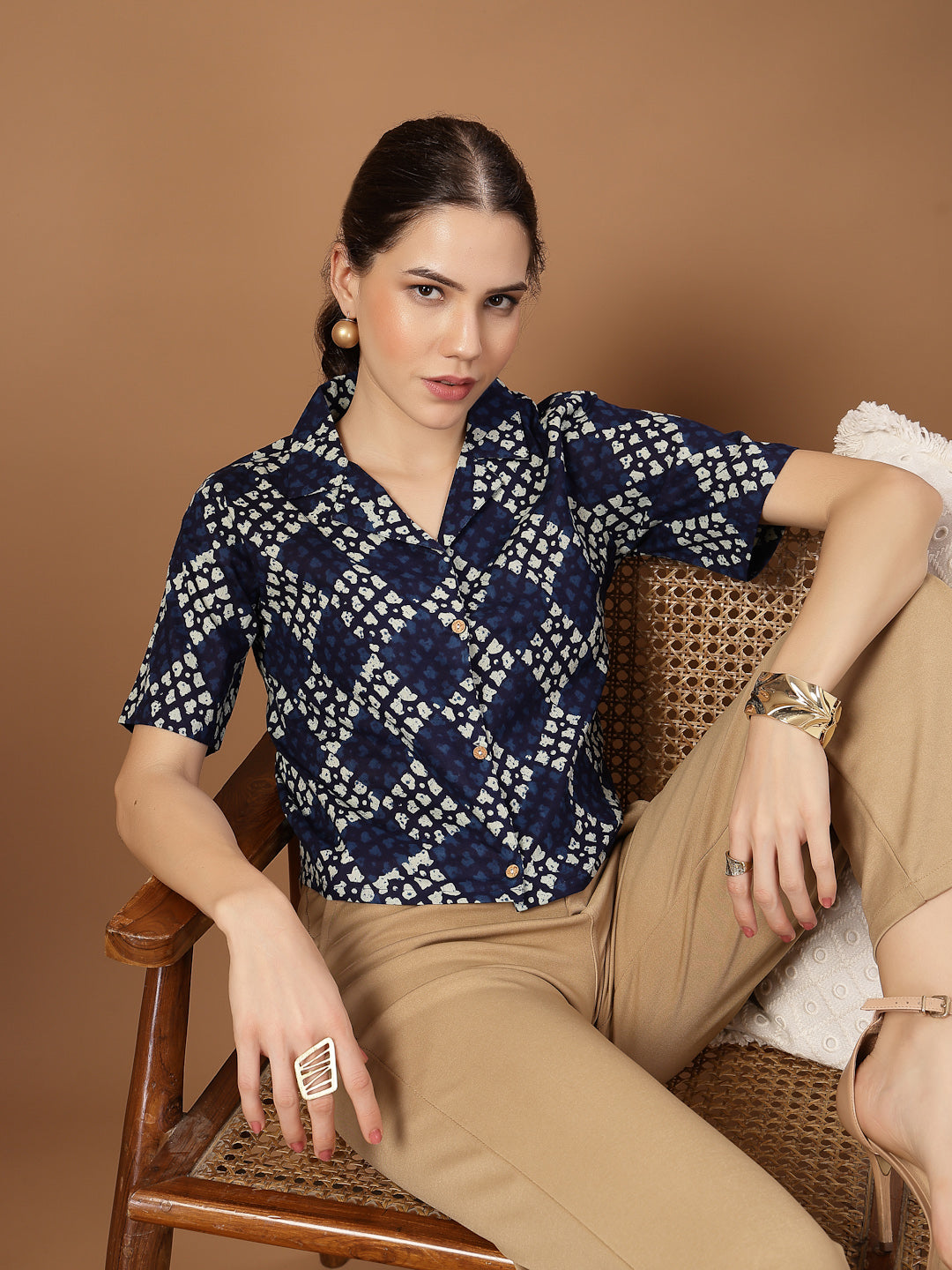 Indigo dabu printed cotton crop top. Top has front button placket on it with shirt collar & short sleeves. Top Length- 20'' Inch. Paired with high waisted black skinny jeans or black wide-leg trousers.