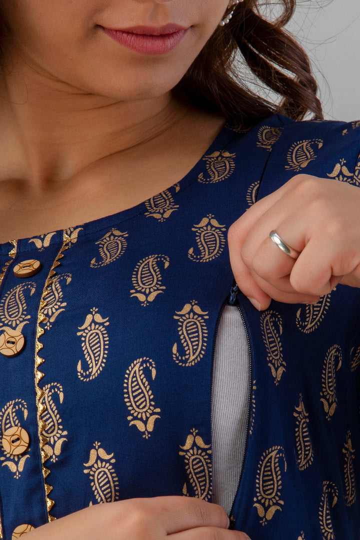 Blue Rayon Floral Printed Maternity and Feeding Dress