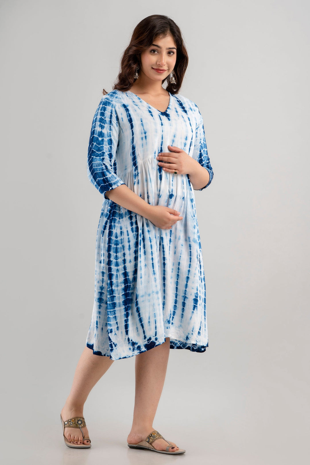 Blue Rayon Shibori Tie-Dye Maternity & Feeding Dress