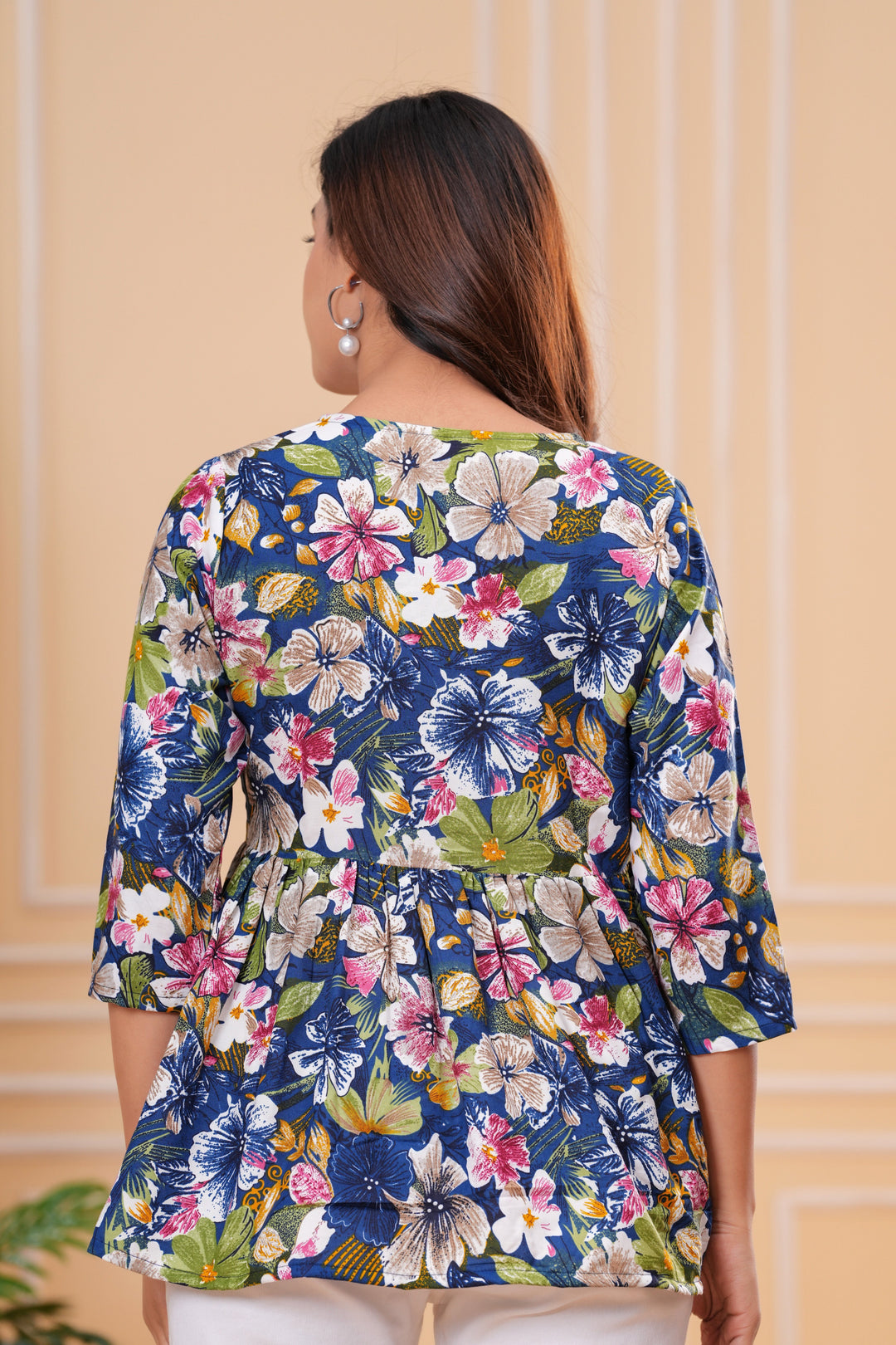 Add a pop of color to your wardrobe with this chic floral printed peplum top! Made from a soft cotton blend, it ensures all-day comfort while keeping you effortlessly stylish. Designed with a flattering peplum silhouette, a graceful round neckline, and breezy three-quarter sleeves, this top is perfect for casual outings or a stylish workwear look. The vibrant multicolor floral print adds a refreshing charm, making it a must-have for every season!