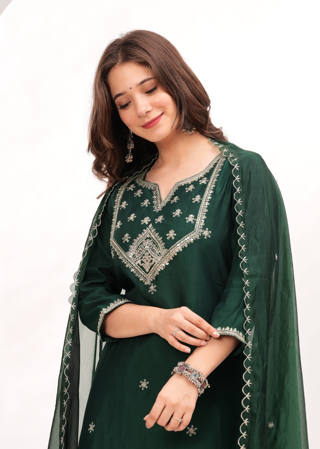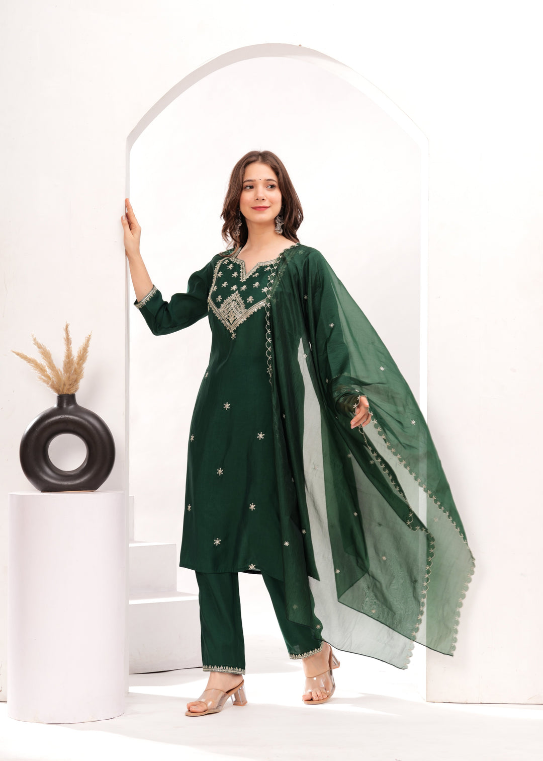 Drape yourself in elegance with this exquisite three-piece embroidered kurta set! The straight-cut kurta, adorned with intricate embroidery on the neckline and hemline, exudes sophistication. Paired with ankle-length trousers featuring a handy pocket and an embroidered dupatta, this ensemble strikes the perfect balance between tradition and modern charm. Ideal for festive gatherings, celebrations, and formal occasions!