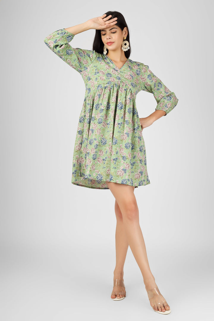 Step into elegance with this chic floral-printed fit-and-flare mini dress. Crafted from a soft wrinkled poly blend, it features a flattering V-neckline, full-length elasticated sleeves, and an above-the-knee silhouette. Perfect for partywear, this stylish one-piece dress ensures a stunning and confident look!