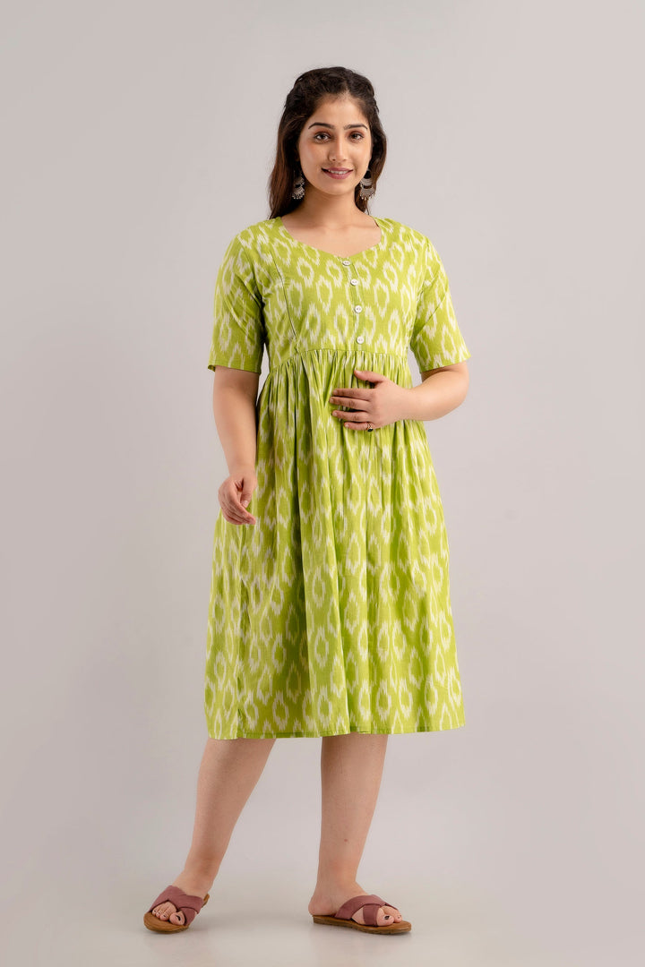 Stay effortlessly comfortable in this lime green Ikat-printed maternity dress, crafted from breathable cotton. Designed with a flared silhouette and half sleeves, it ensures ease of movement, while discreet side zippers provide convenient nursing access. A stylish and practical choice for new and expecting moms!