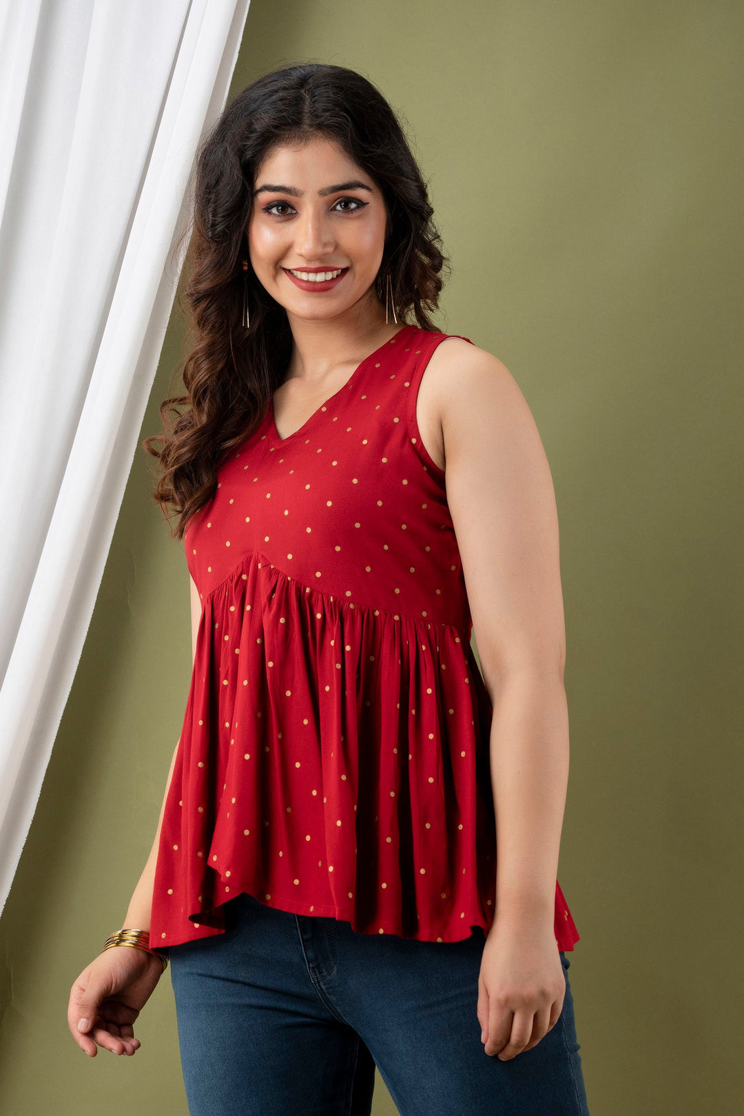 Step up your style with this chic maroon polka dot flared top, featuring a flattering V-neckline and a sleeveless design. Made from lightweight and breathable rayon fabric, it's perfect for all seasons, offering both comfort and a trendy look!