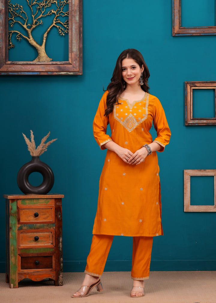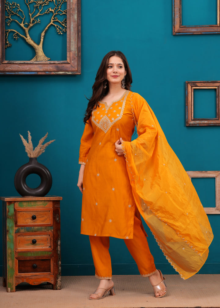 Channel refined elegance with this striking mustard silk blend kurta set! The beautifully embroidered kurta, paired with well-fitted ankle-length trousers featuring a functional pocket, creates a flattering silhouette. The embroidered dupatta adds the perfect finishing touch, making it an ideal choice for festivities, formal occasions, and cultural celebrations.