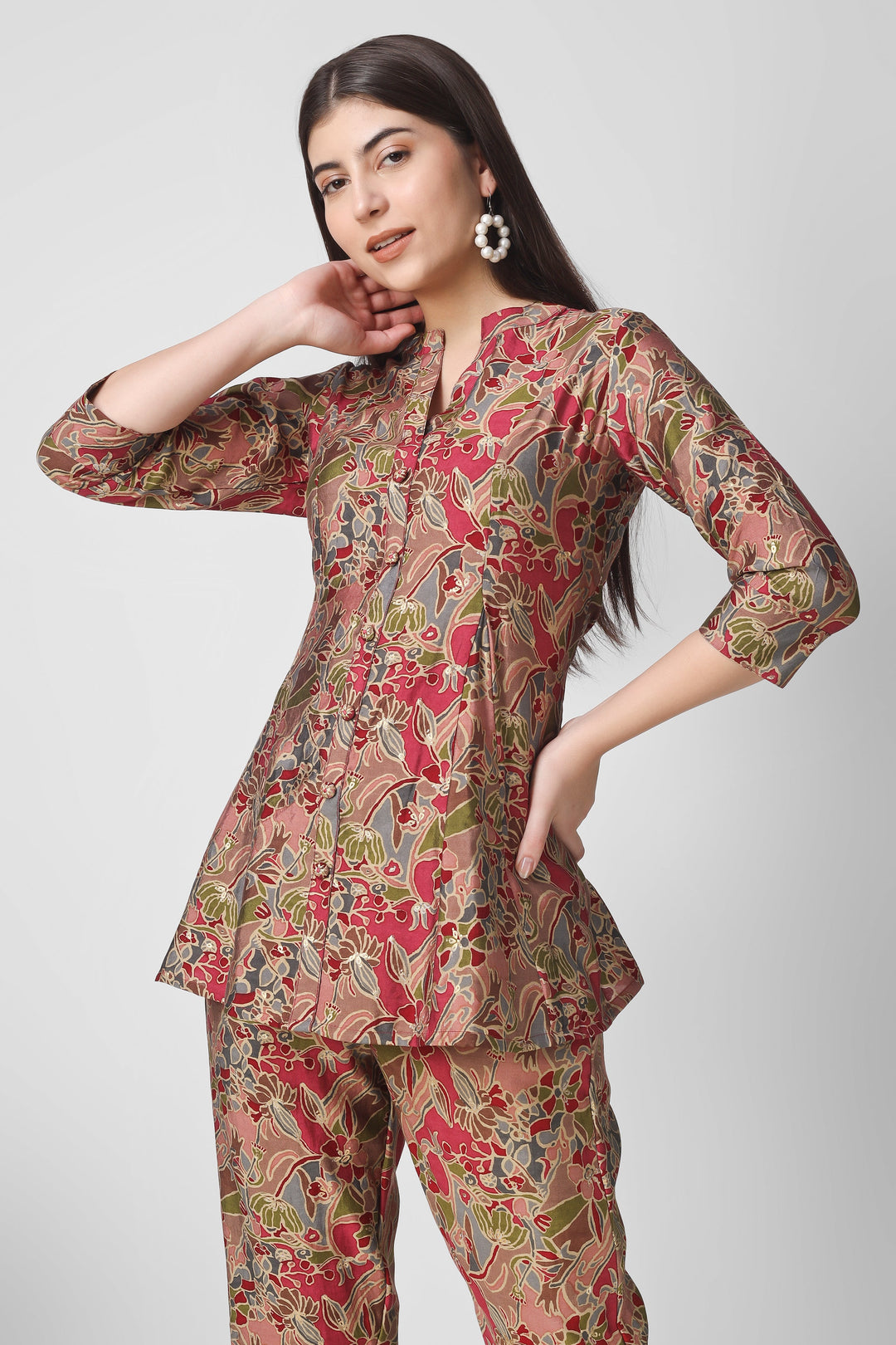 Embrace timeless elegance with this pink Chanderi silk co-ord set, adorned with a vibrant multicolored floral print. Designed for both style and comfort, this set includes a beautifully tailored top and matching bottoms, making it perfect for festive celebrations, casual outings, or statement everyday wear!