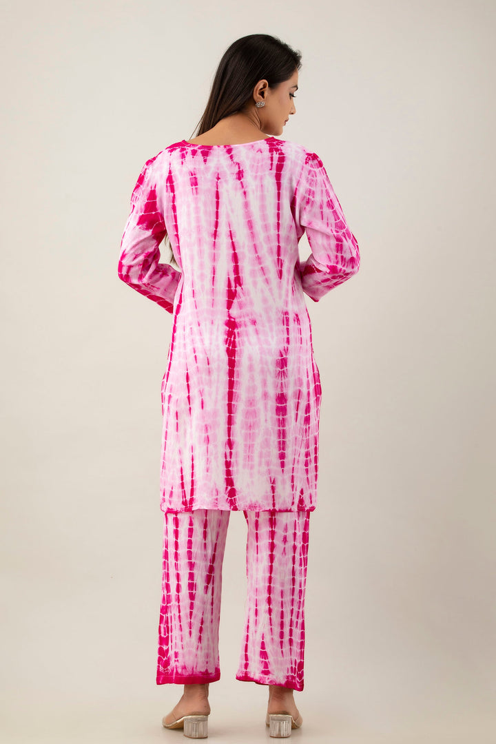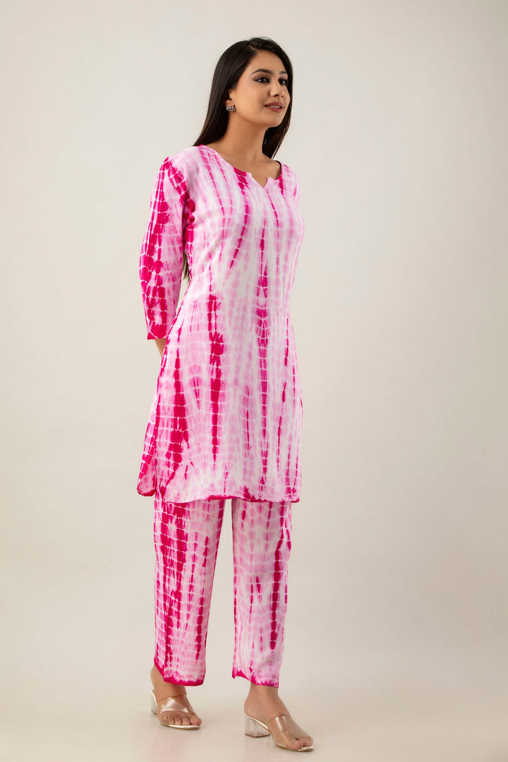 Brighten up your everyday wardrobe with this stylish Shibori tie-dye co-ord set. Made from soft and breathable rayon fabric, it features a chic calf-length kurta paired with comfortable pants, complete with practical side pockets. Perfect for effortless casual wear with a trendy touch!