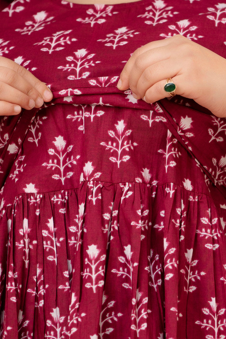 Stay comfortable and stylish during pregnancy with this purple floral-printed maternity dress. Crafted from soft, breathable cotton, it features a flattering flared silhouette, 3/4 sleeves, and a round neckline. Making it the perfect blend of fashion and functionality for new and expecting moms.